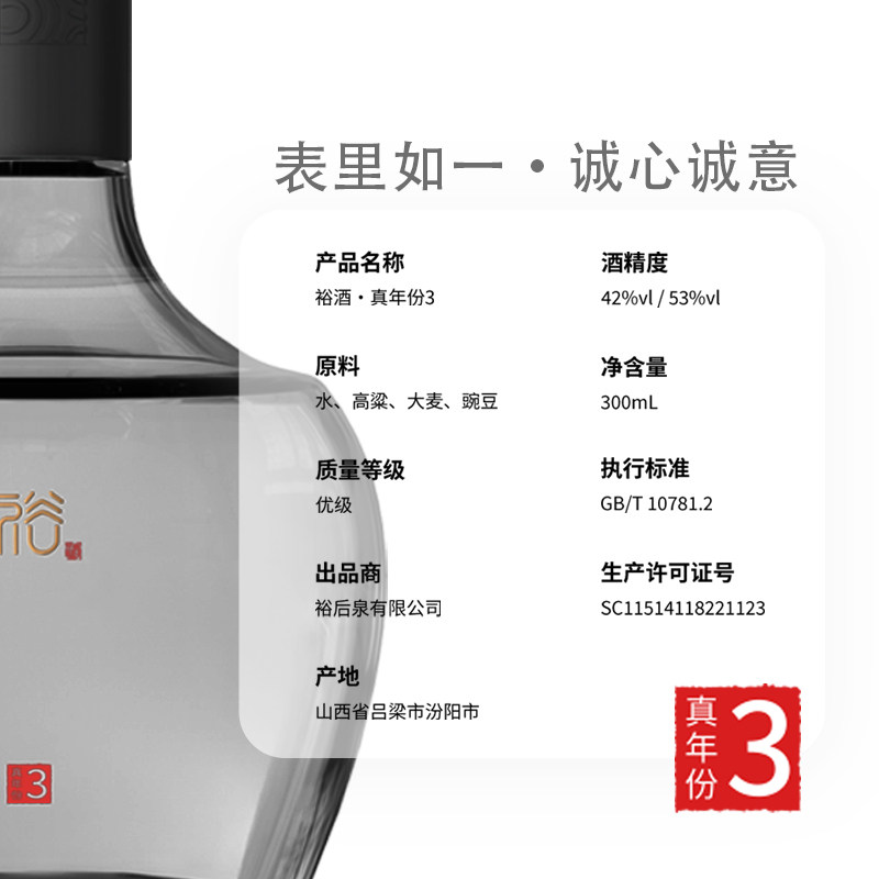 裕酒真年份3清香型白酒山西特产官方正品纯粮食高粱300ml小瓶品鉴
