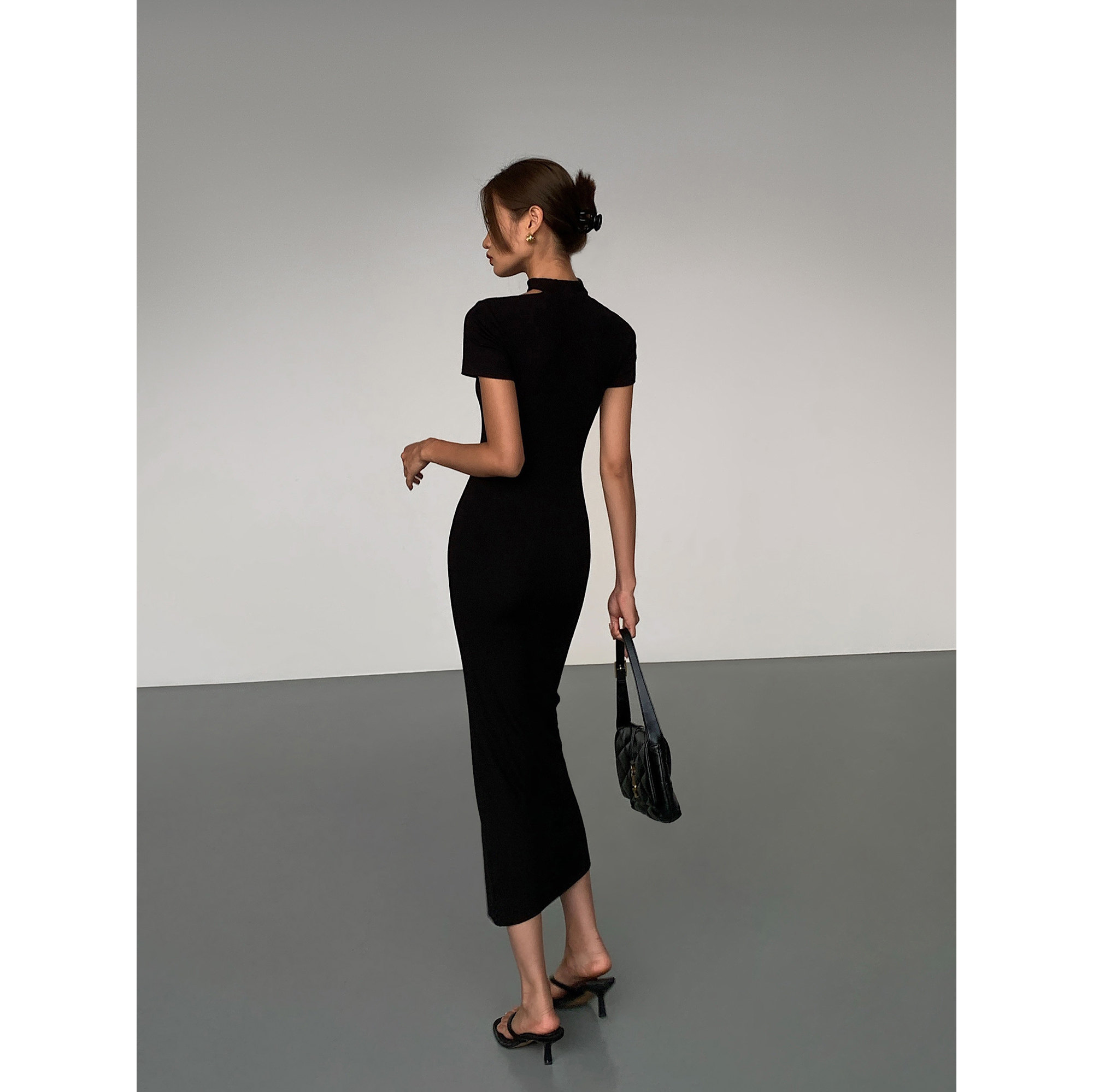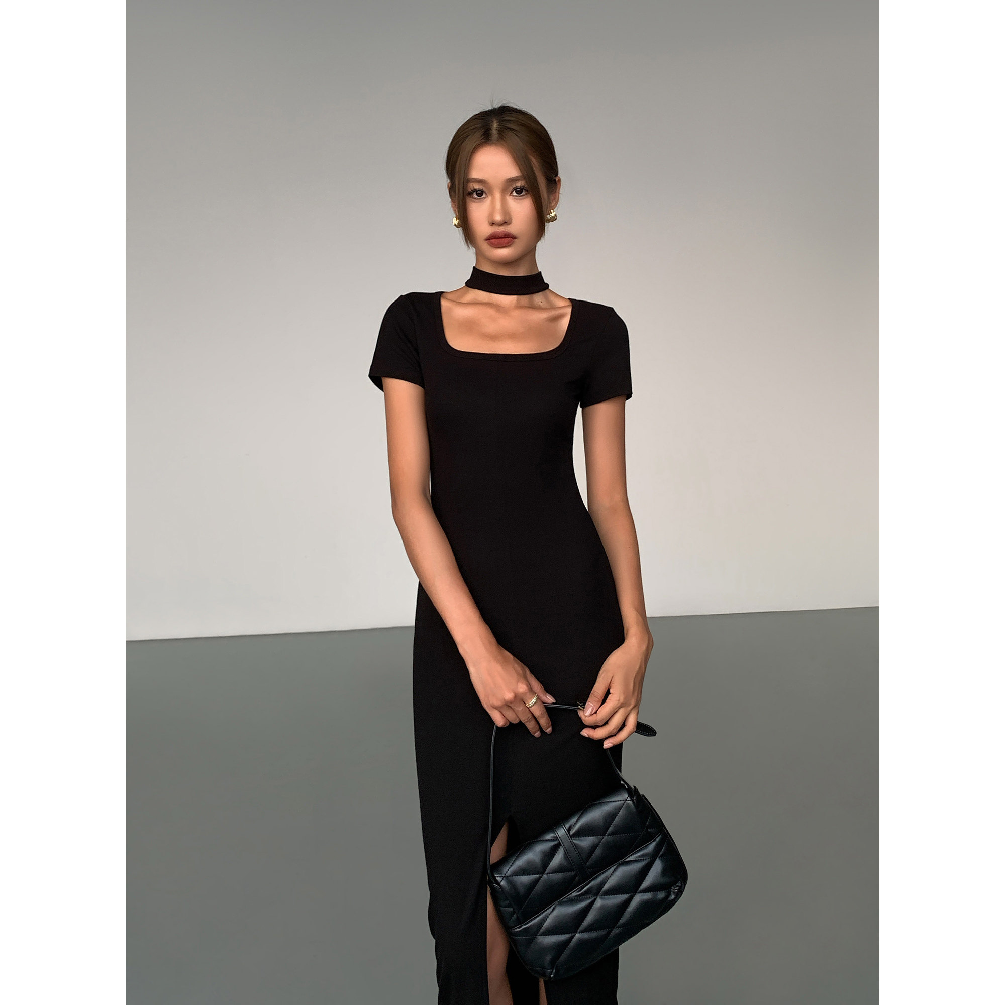 ousph性感法式开叉夏新长款女装小黑色修身连衣裙子短袖气质方领
