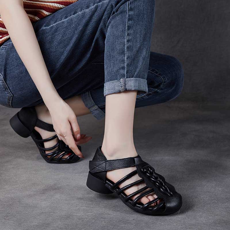原创手工女鞋全牛皮编织凉鞋女士包头外穿防滑魔术贴中老年妈妈鞋