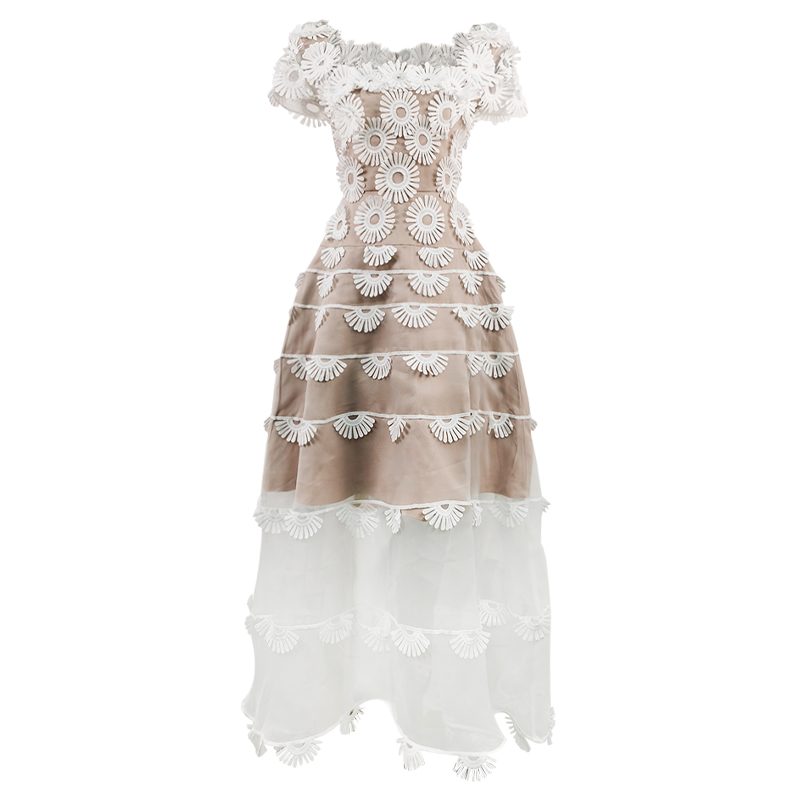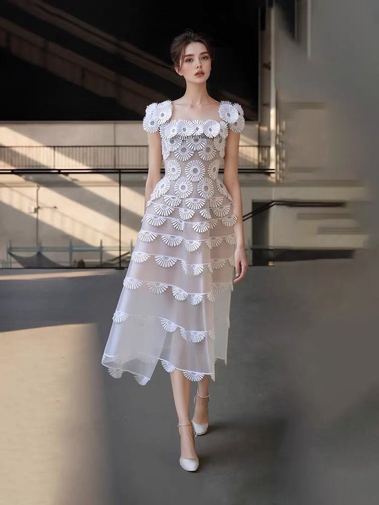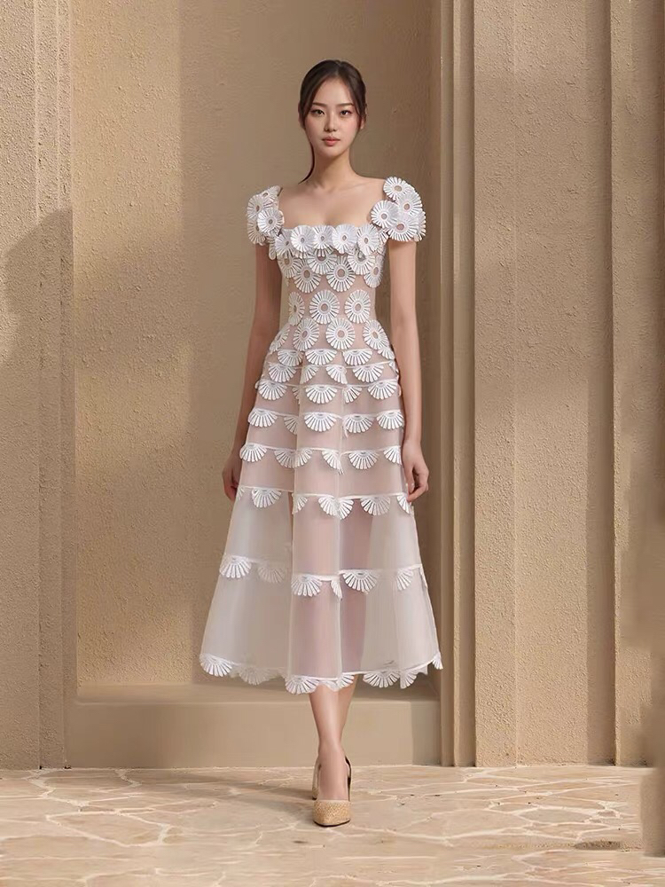 越南小众设计师千金风方领白色长裙女雏菊立体花朵收腰显瘦连衣裙