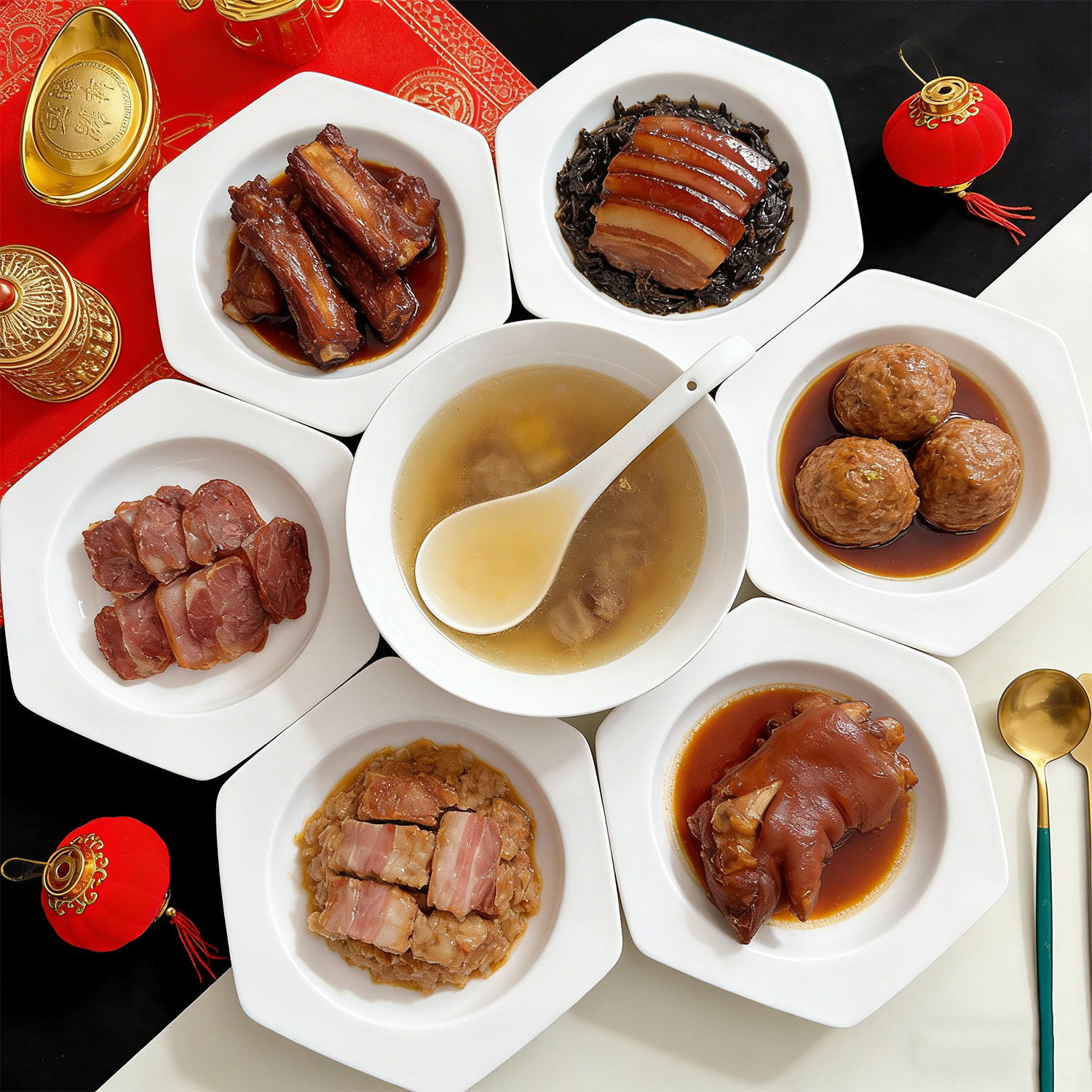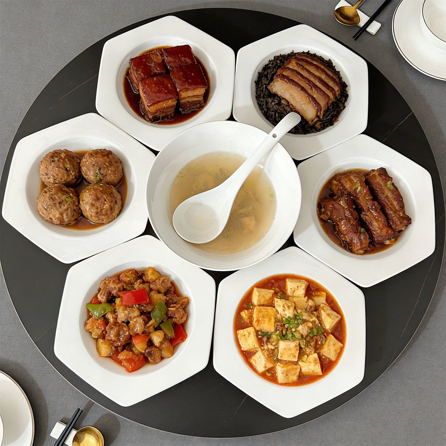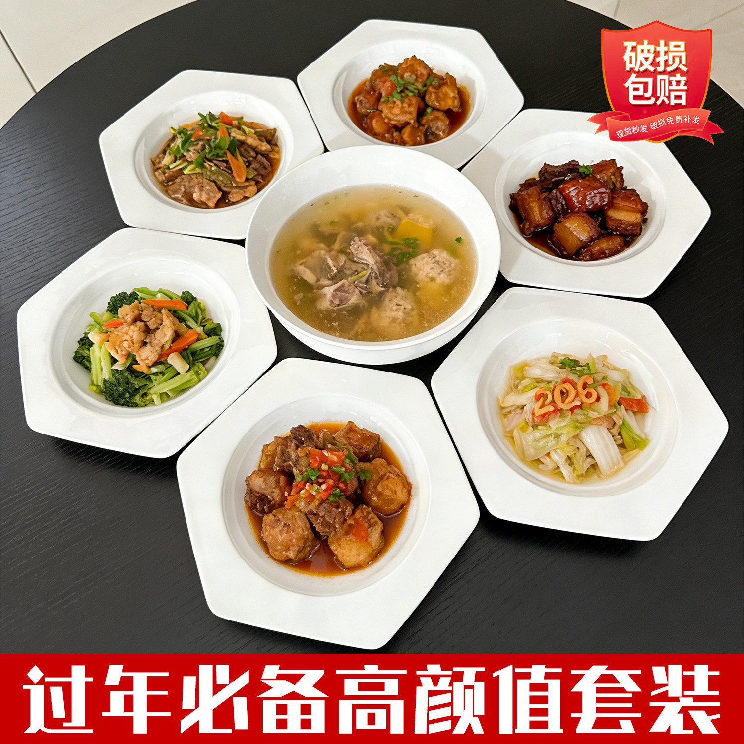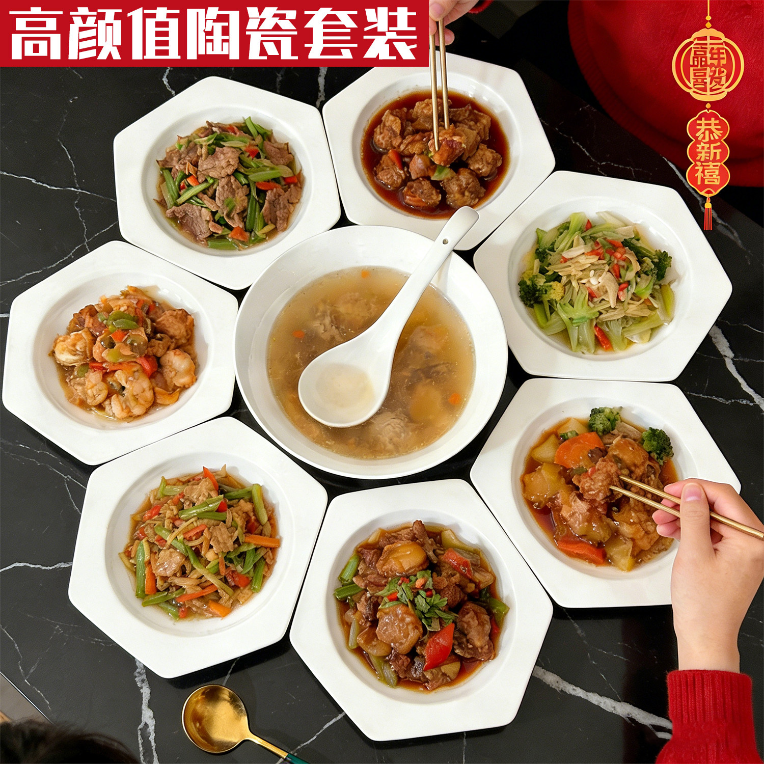 套装白色六角盘大汤碗大汤勺拼盘组合餐具陶瓷家用釉下彩菱形饭盘