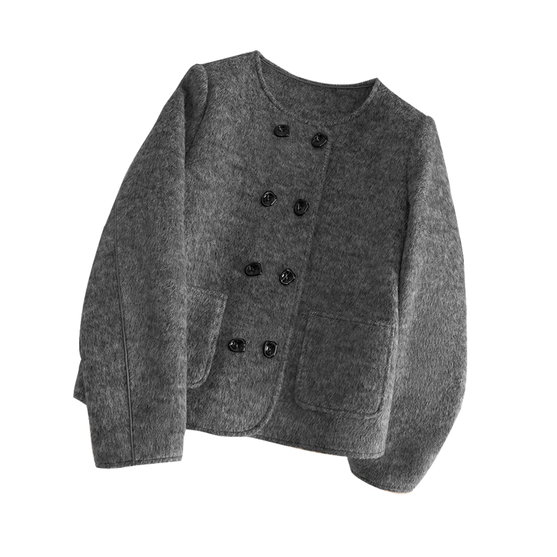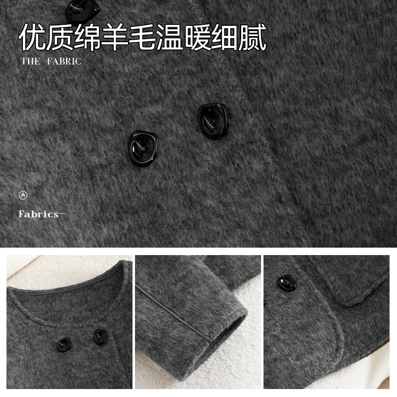 她池毛呢外套2025冬装新款女装通勤圆领双排扣长袖短款绵羊毛上衣