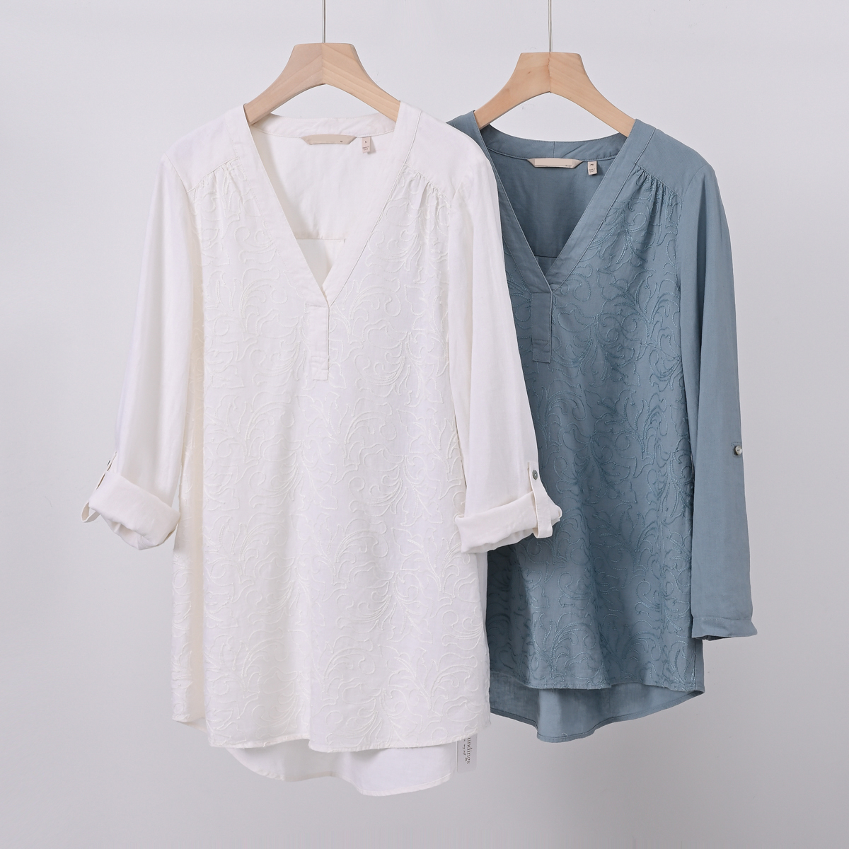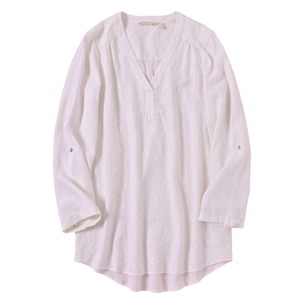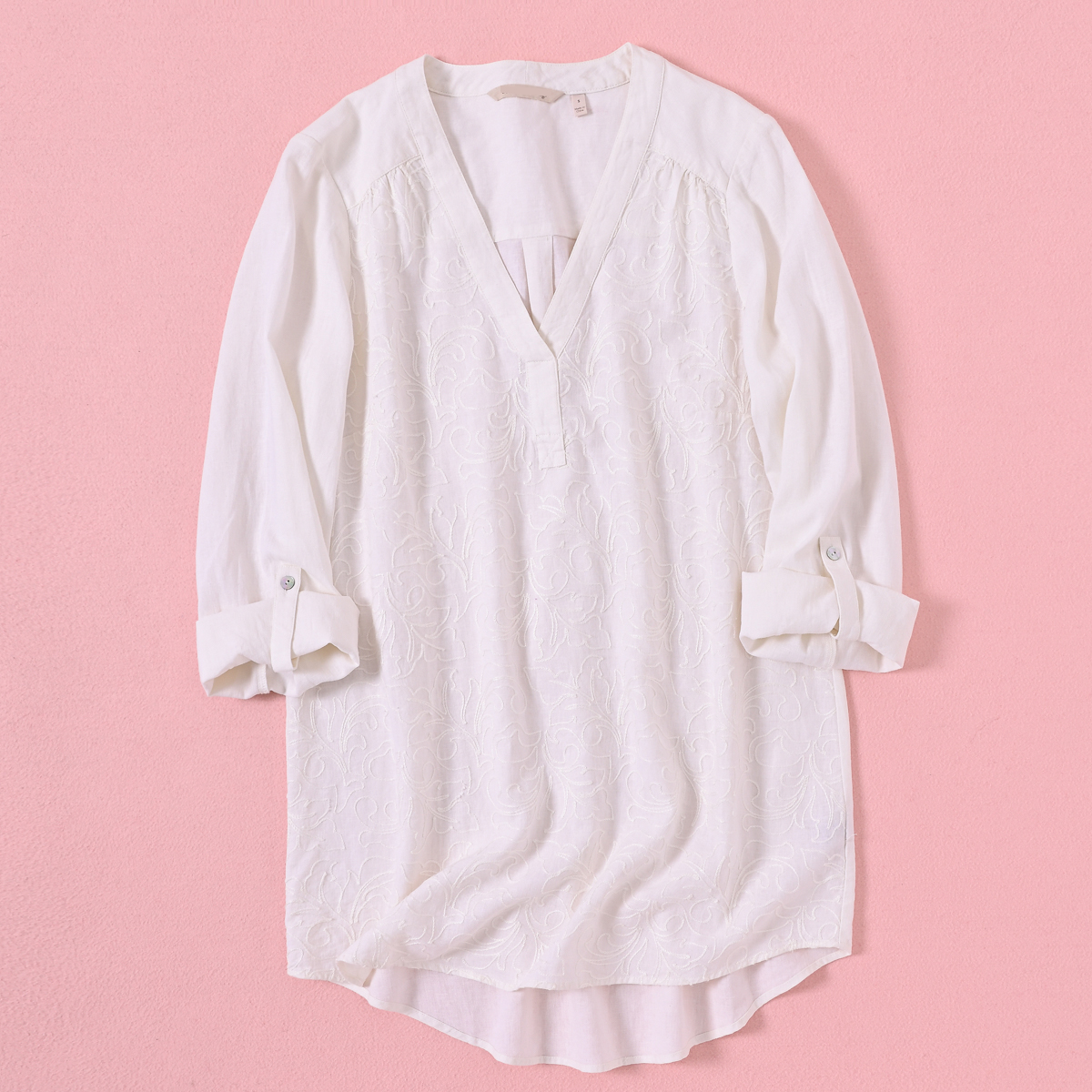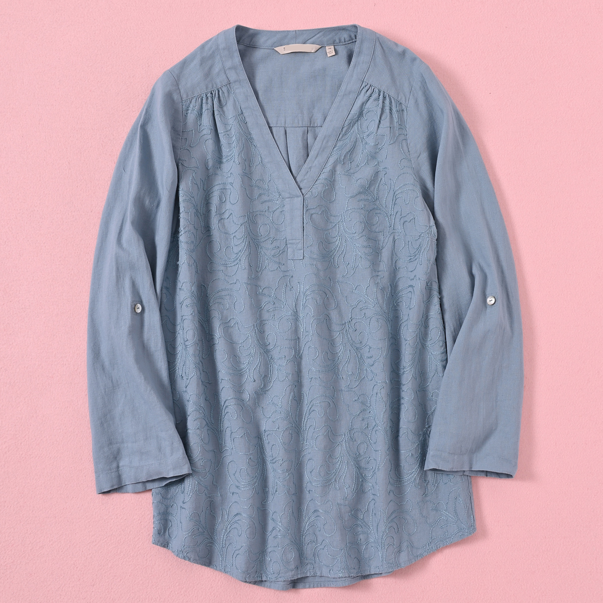 欧美水洗亚麻刺绣V领中长款显瘦套头棉麻衬衫 外贸原单女装大码夏