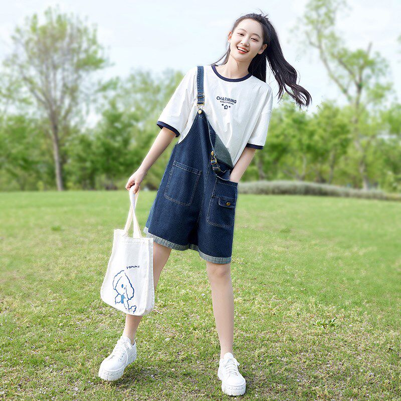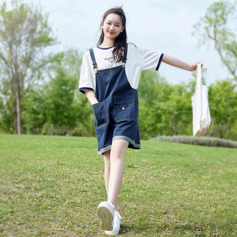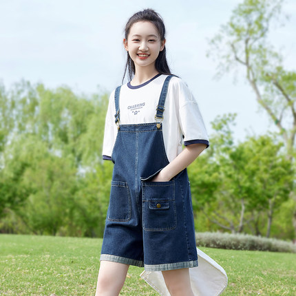 初中生套装少女牛仔背带裤中学生新品韩版13岁连体吊带裤两件套女