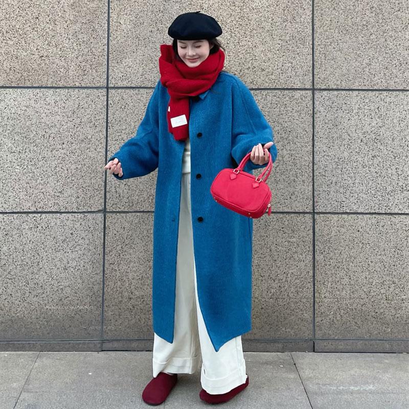 克莱因蓝女冬季新款毛呢外套中长款单排扣宽松韩版小个子呢子大衣