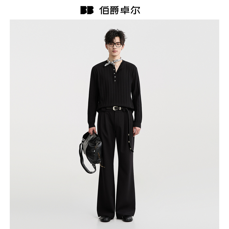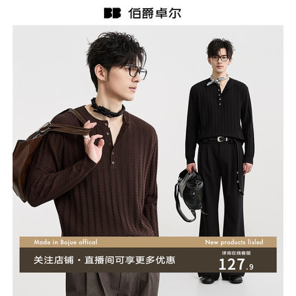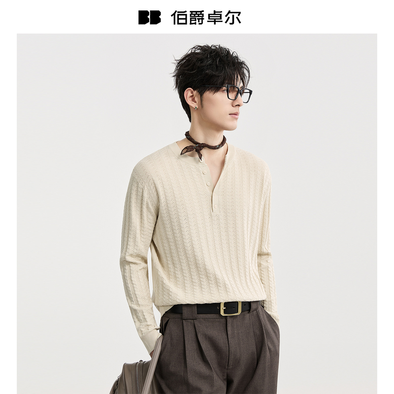 {亨利领提花肌理感}伯爵卓尔25秋季针织款长袖T恤男士休闲打底衫