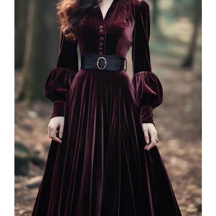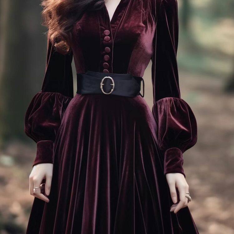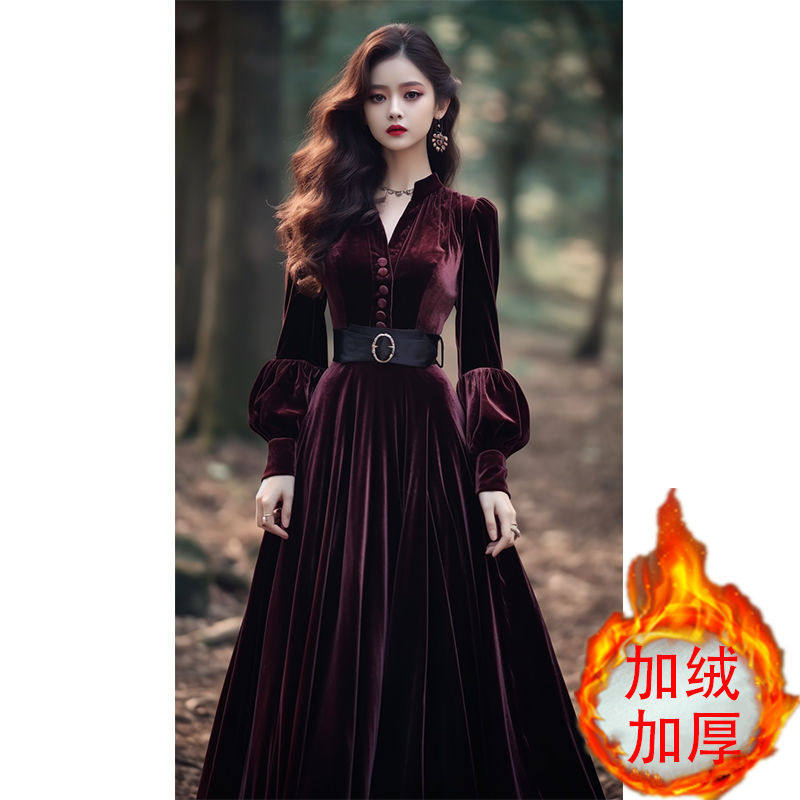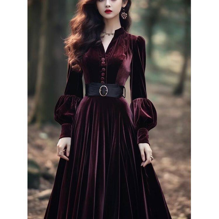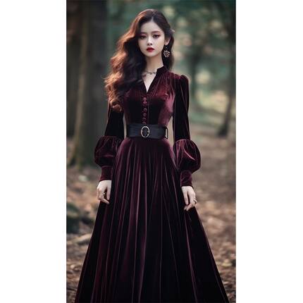 法式高端精致正式场合礼服长裙气质超好看红色丝绒连衣裙子女秋冬