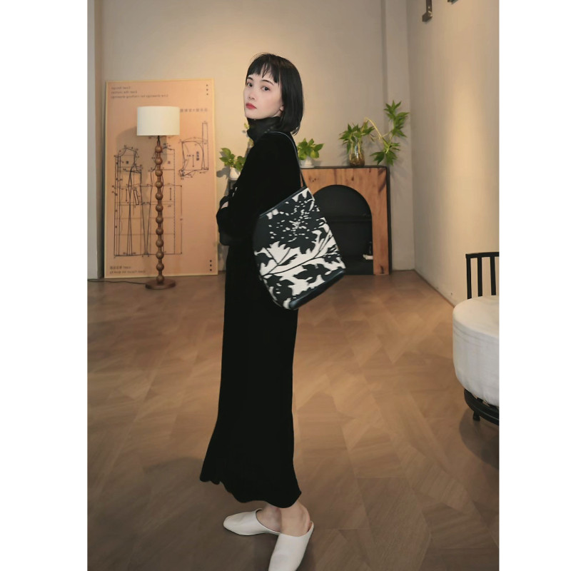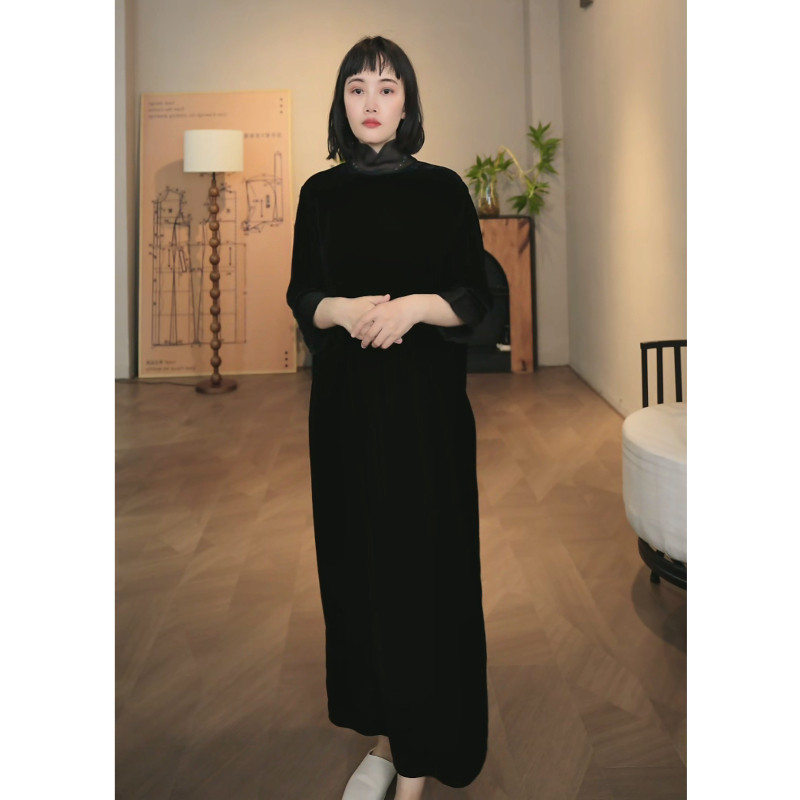 原创轻奢贵气高级感黑色真丝绒桑蚕丝连衣裙新款优雅禅意长裙
