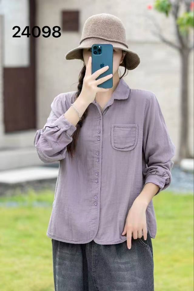 2024秋季新款女士衬衫 宽松休闲棉麻上衣女 文艺复古纯色长袖女装