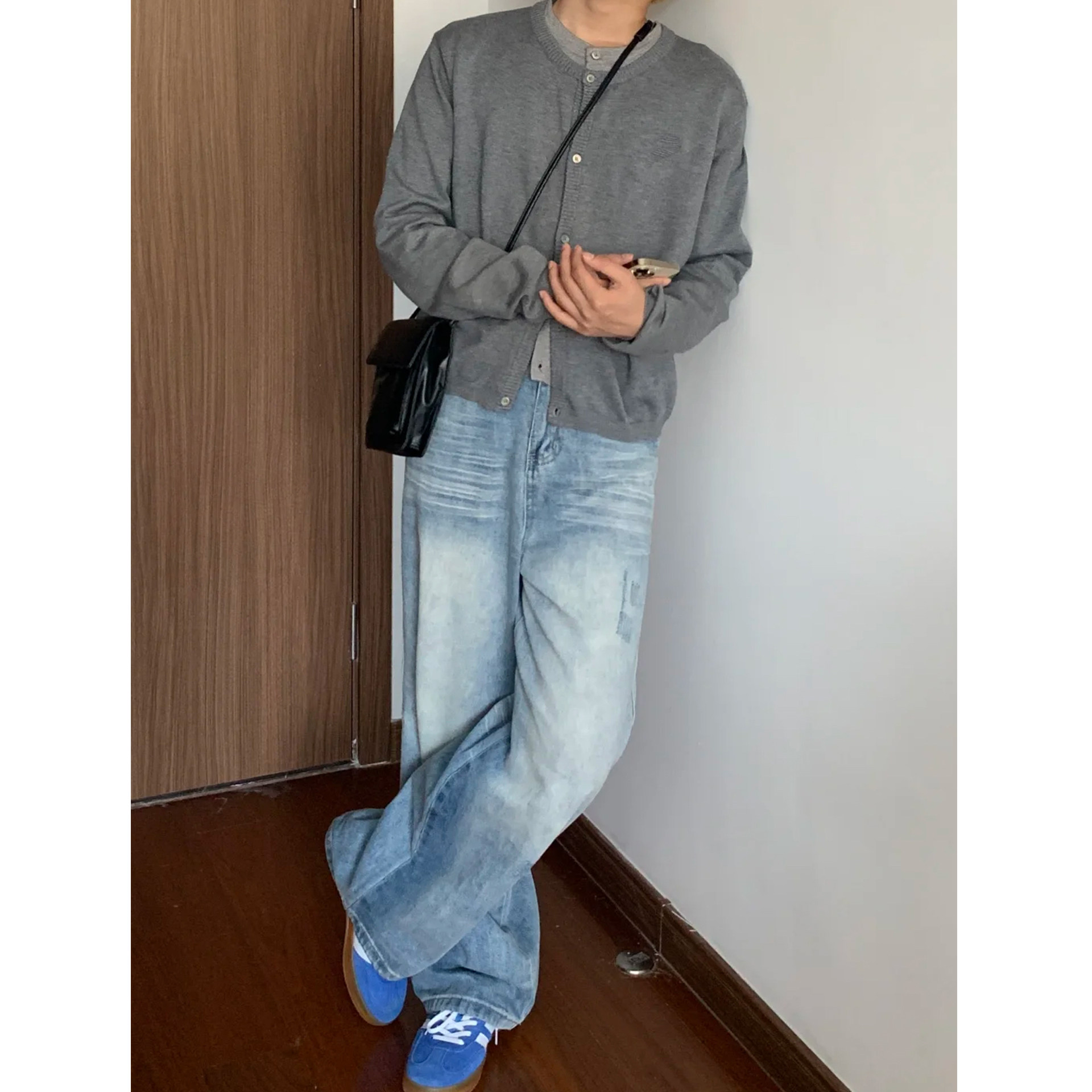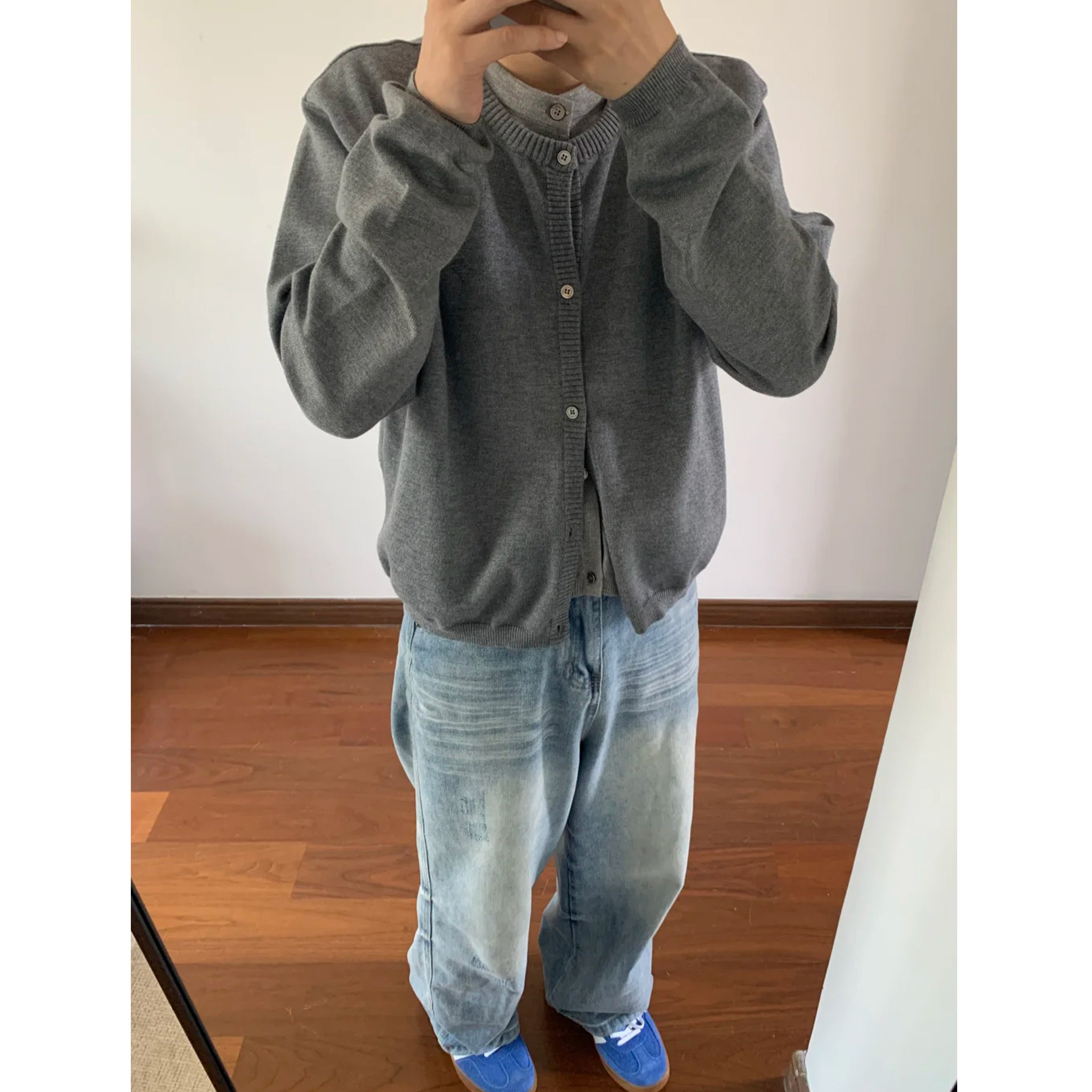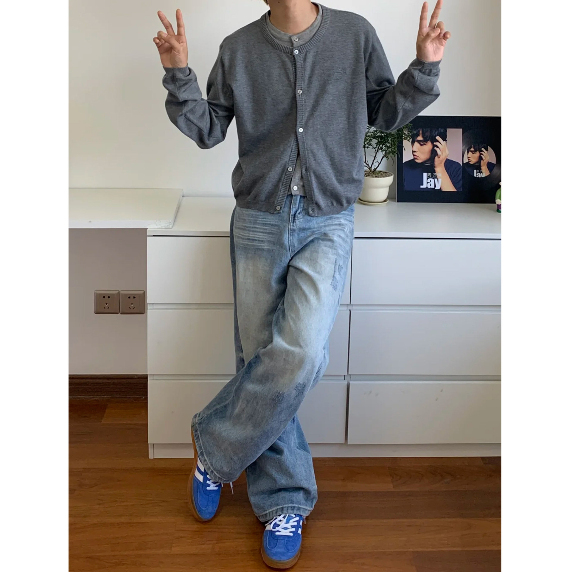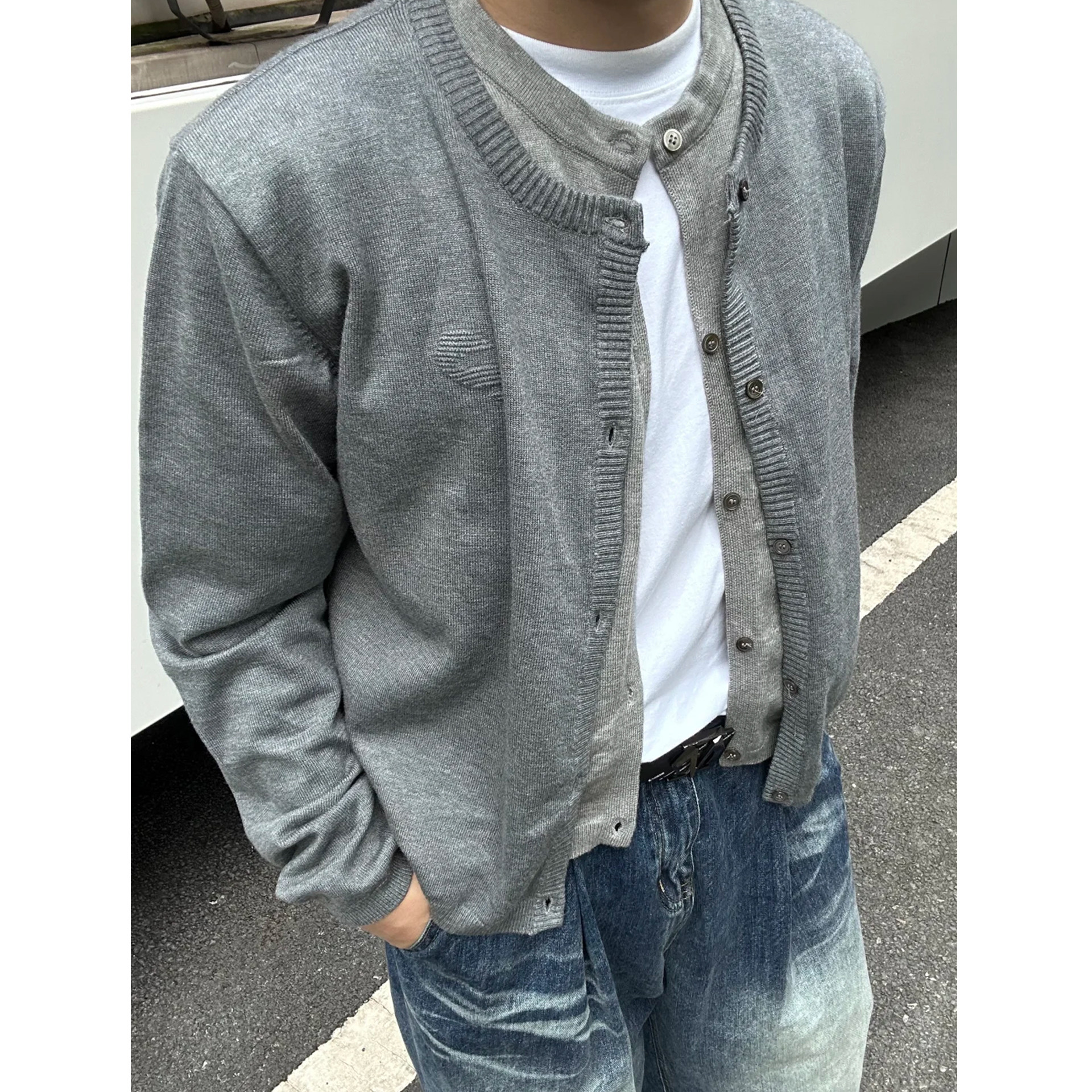 韩系时髦感假两件撞色拼接针织衫男女秋季慵懒风短款开衫毛衣外套
