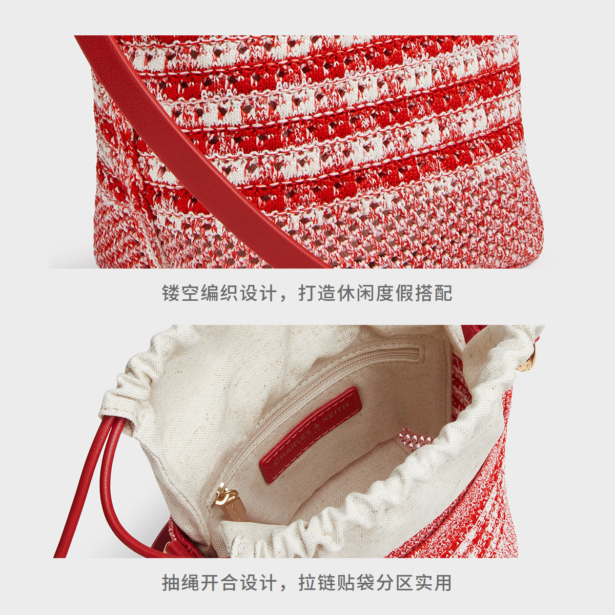 [折扣推荐]CHARLES&KEITH水桶包CK11-10782618镂空编织抽绳斜挎包