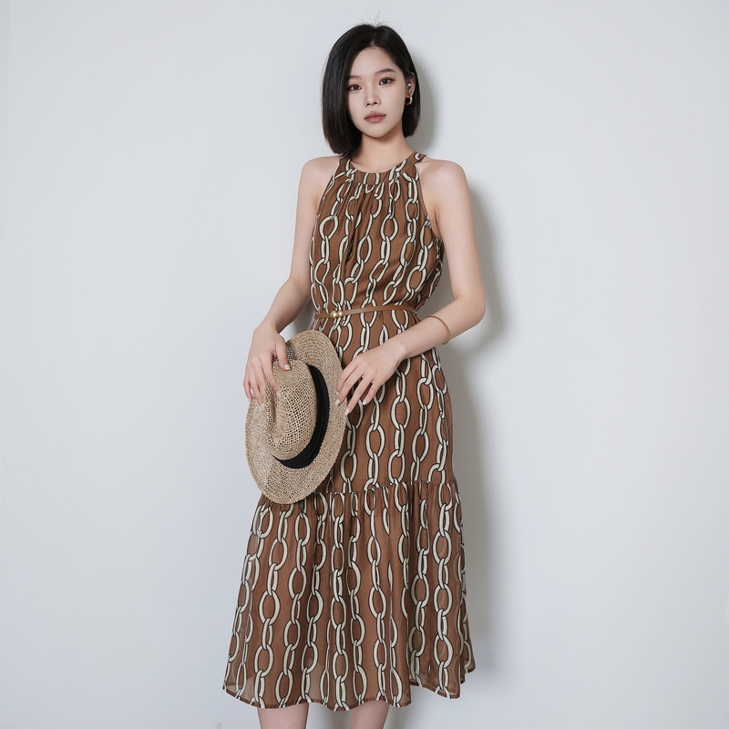 Migaino曼娅奴女装2025夏季新款摩登气质感挂脖无袖印花连衣裙