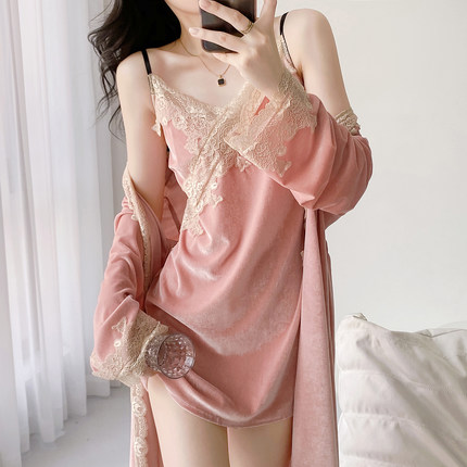 女款金丝绒蕾丝吊带睡裙睡袍套装