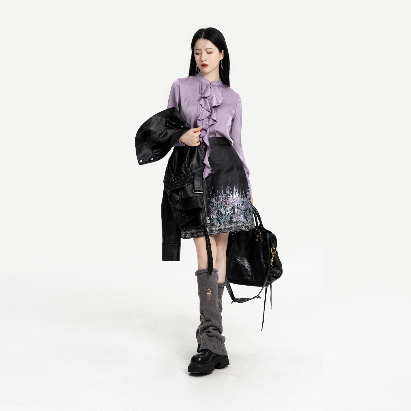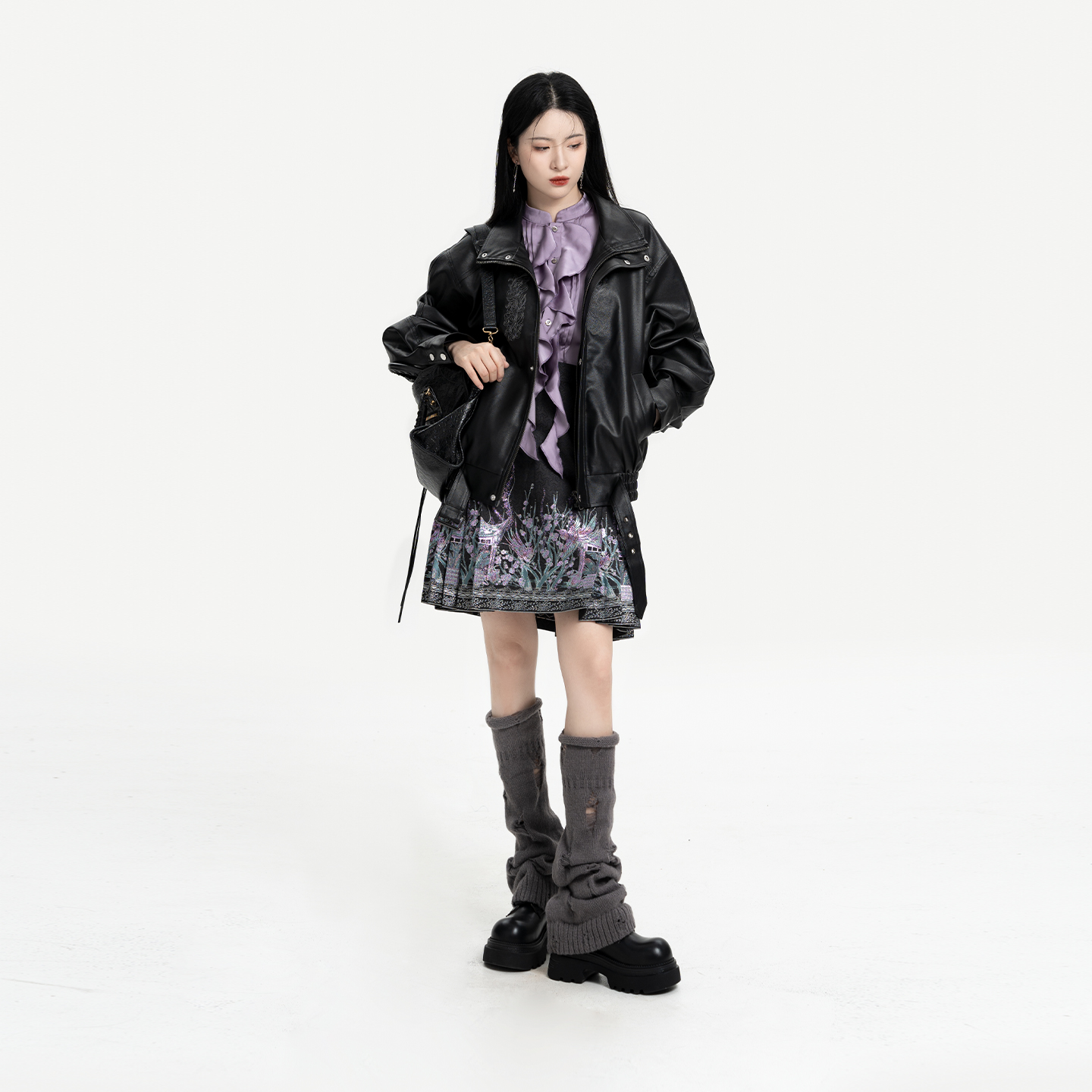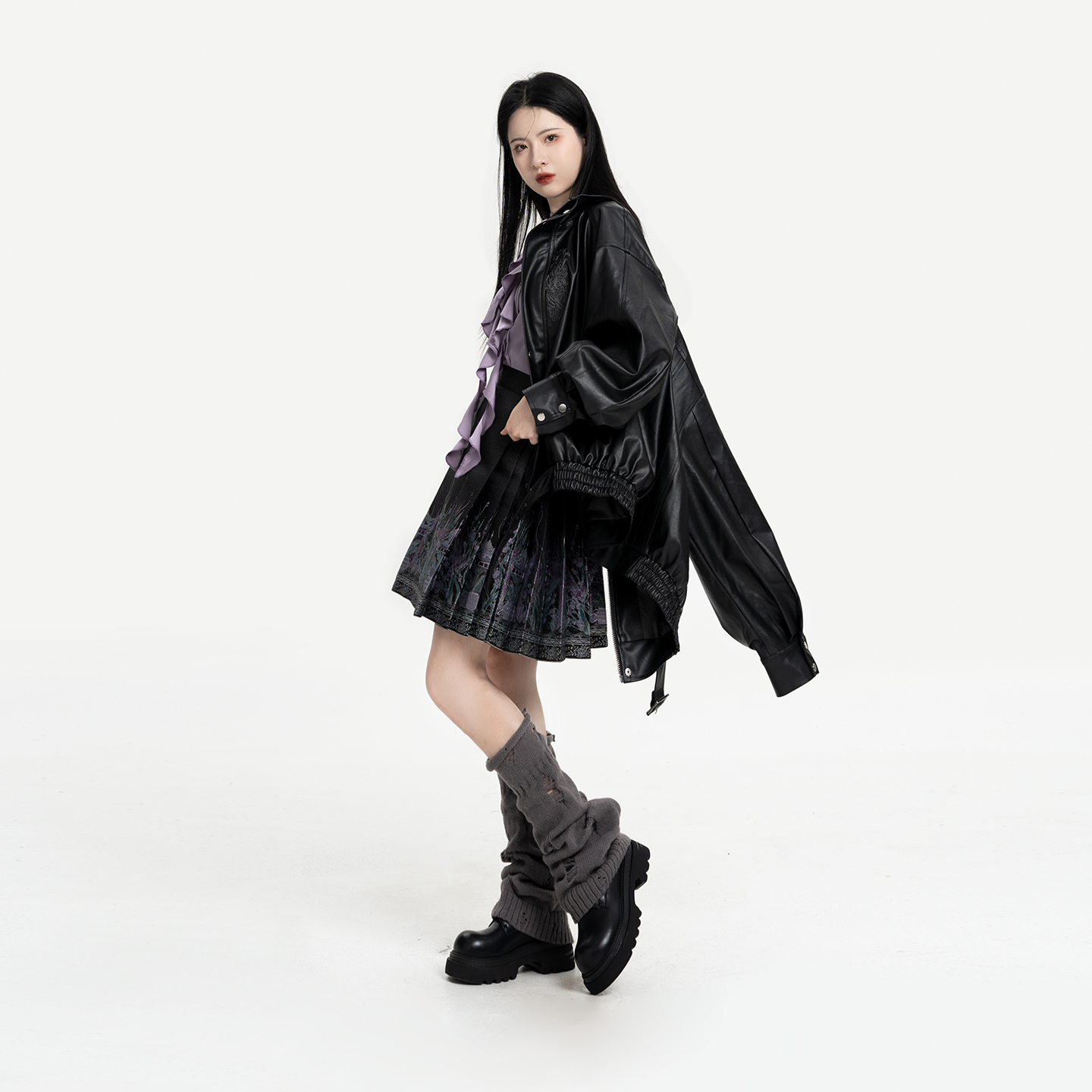 织造司[极夜流光]中式朋克风短款翻领皮衣外套女立领衬衫短马面裙