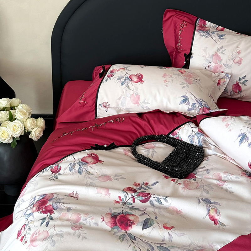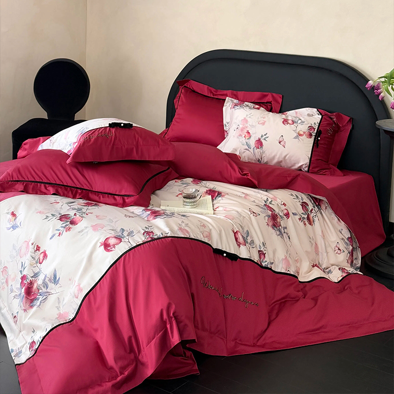 高端石榴花婚庆四件套100S长绒棉印花全棉纯棉轻奢风红色结婚床品