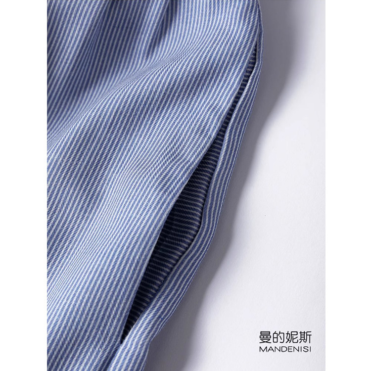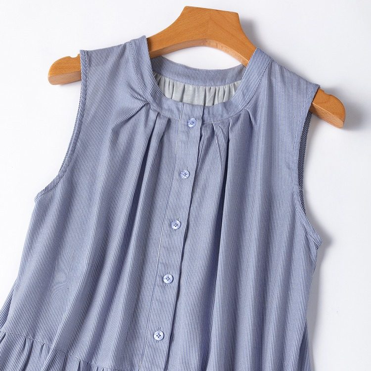 蓝白条纹减龄真丝加棉小立领无袖大摆蛋糕裙加长连衣裙背心裙子女