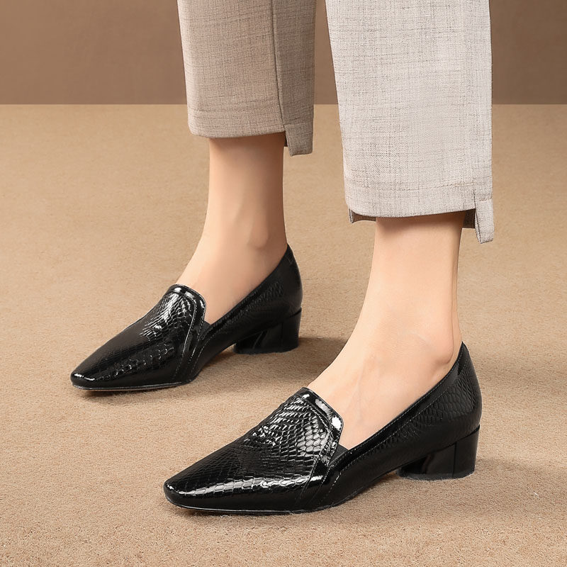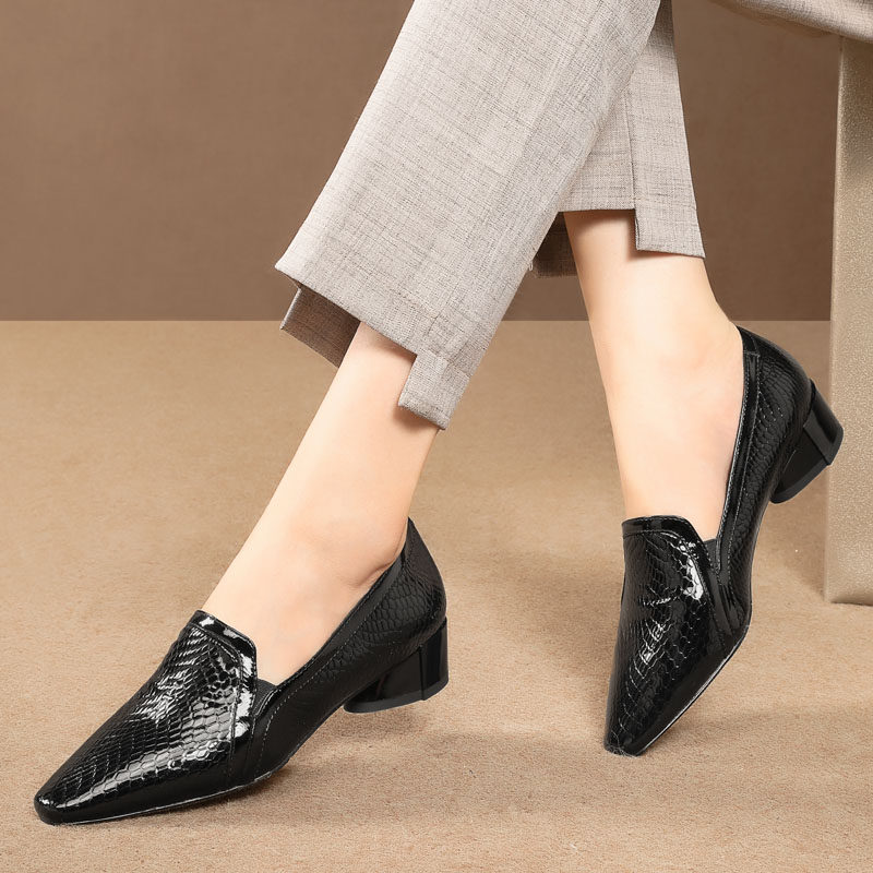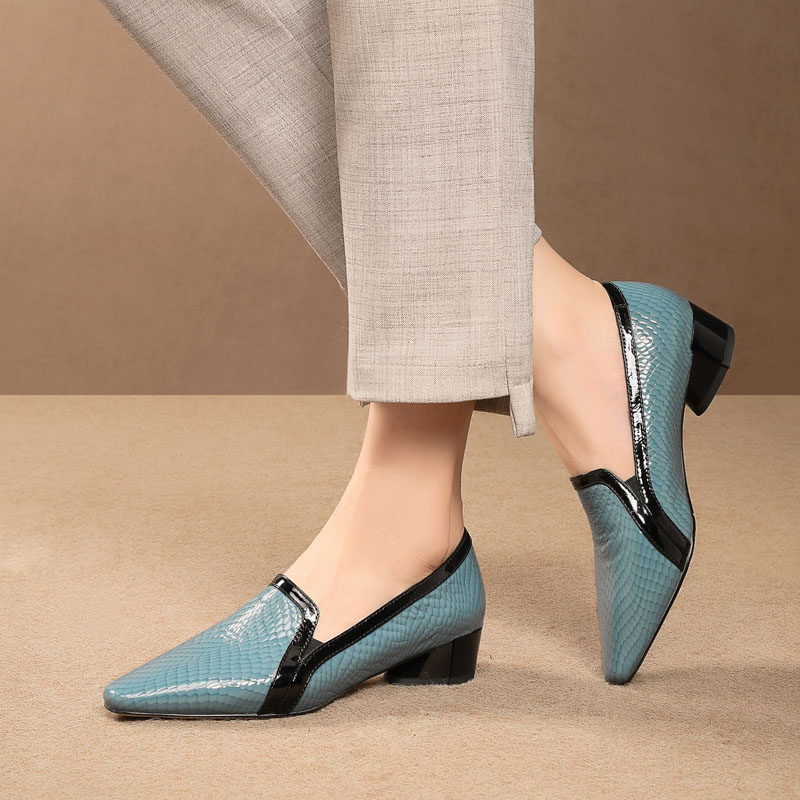 中跟单鞋女漆皮春秋新款时尚百搭舒适拼色方头粗跟软底大码女鞋子