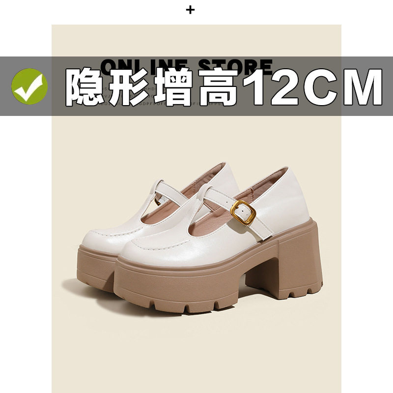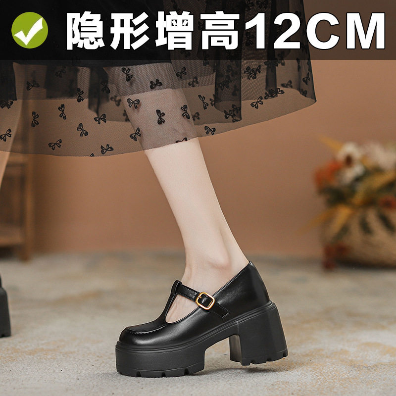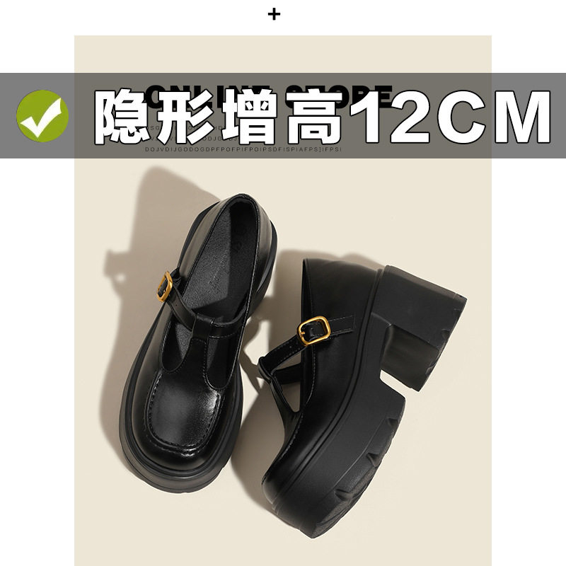 黑色现货带一字玛丽珍鞋粗跟圆头12CM浅口单鞋小码33内增高