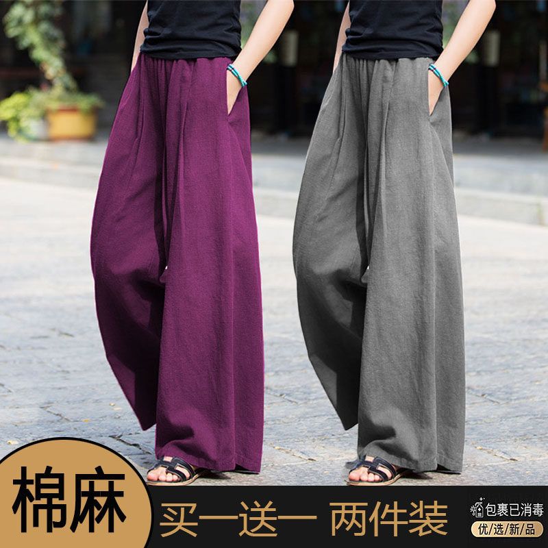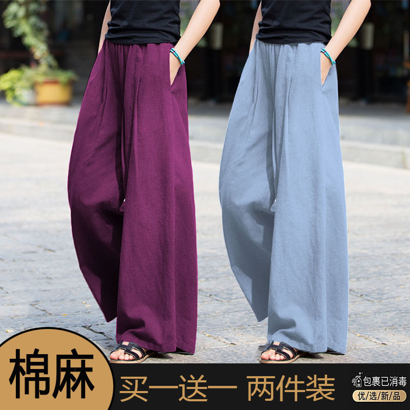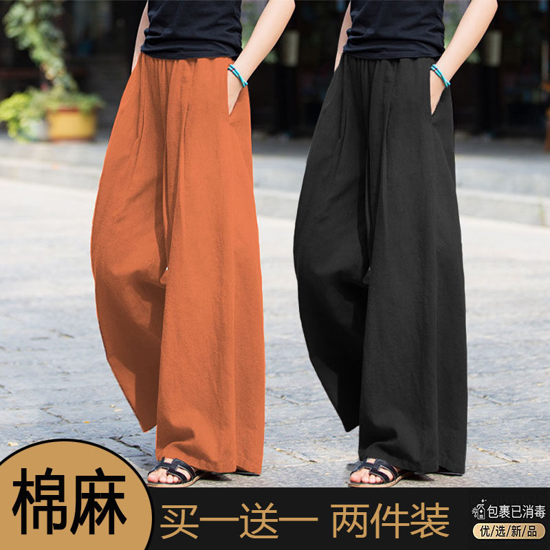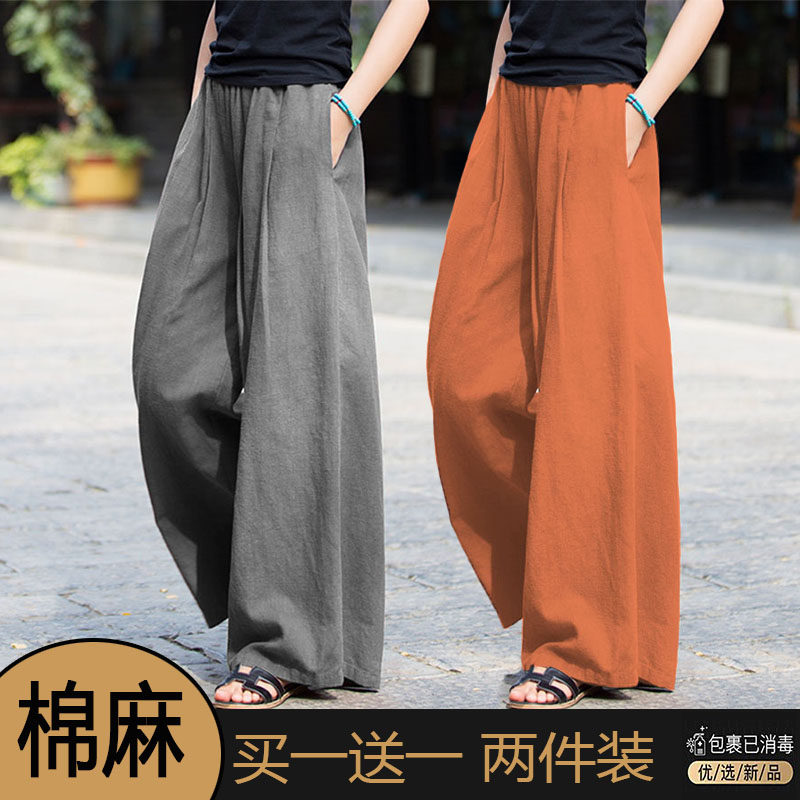 单/两件 棉麻显瘦休闲阔腿裤女松紧腰夏季薄款高腰宽松大码长裤子
