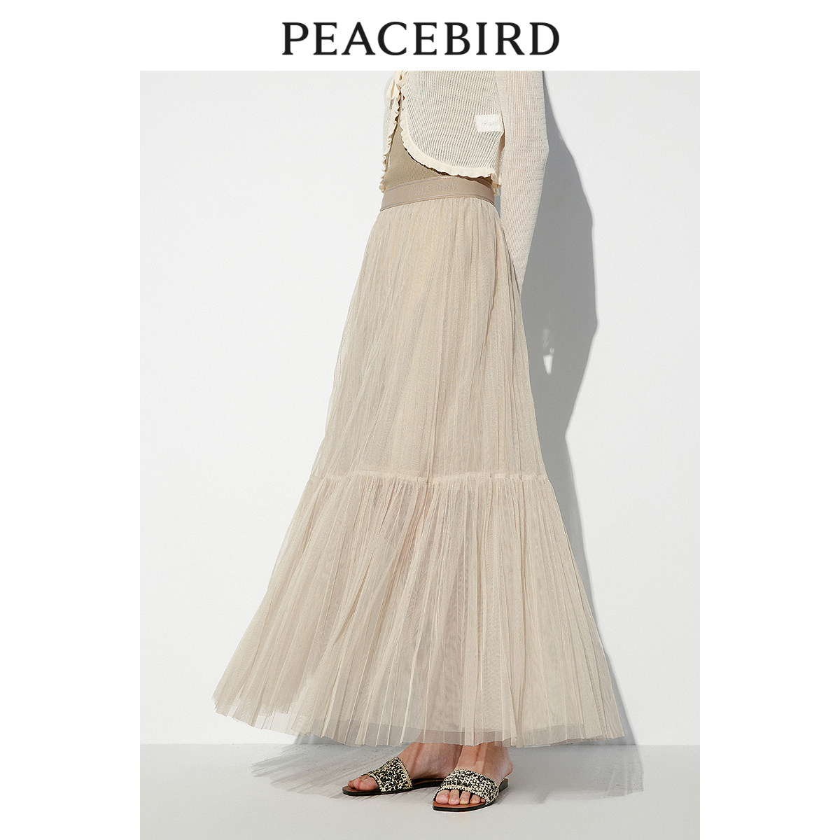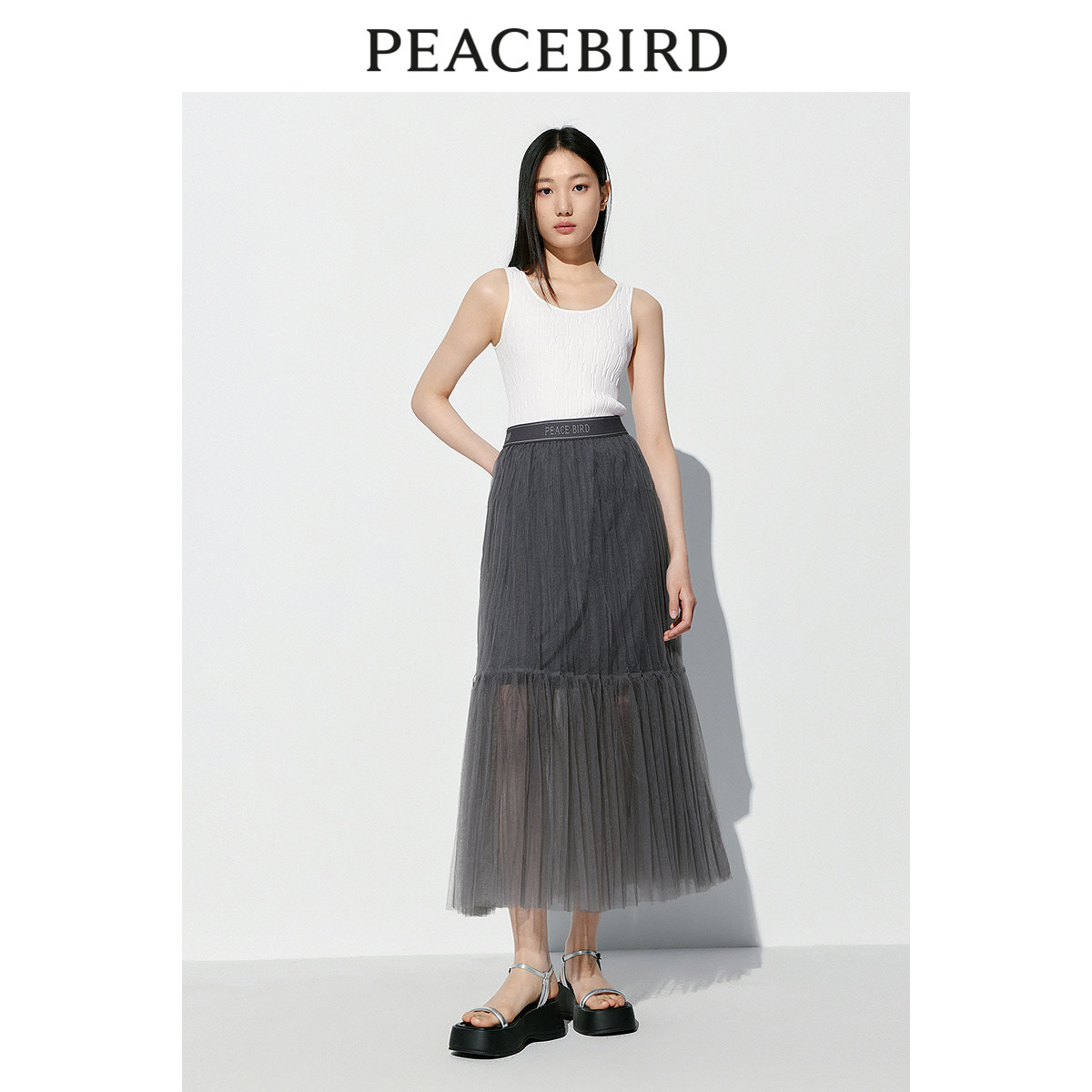 太平鸟女士百搭不规则压褶纱裙2024夏季新款中长款灰色半身裙时尚