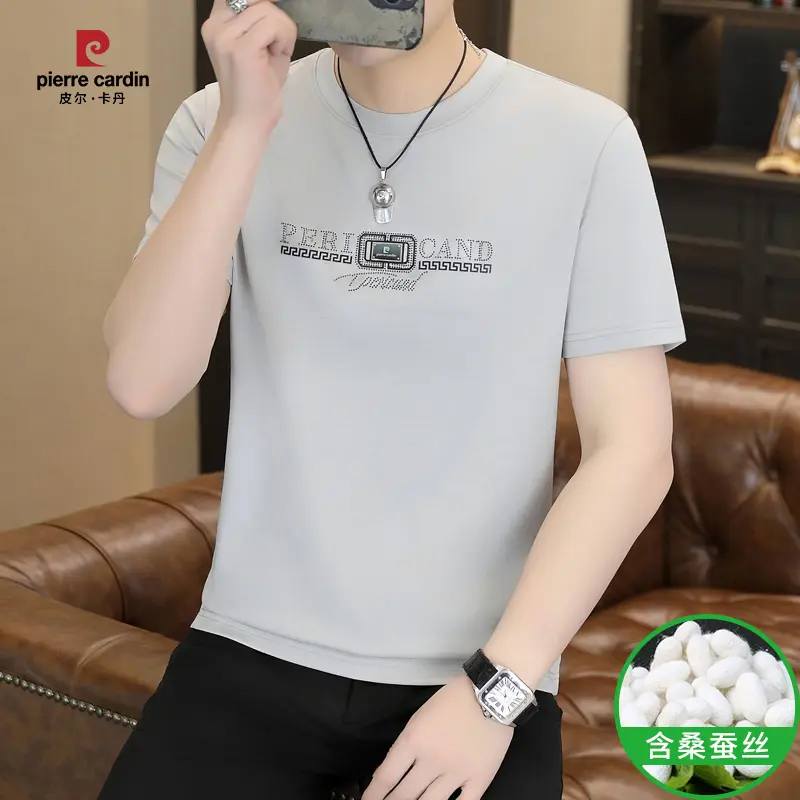皮尔卡丹男士短袖T恤2025夏季新款桑蚕丝圆领上衣时尚百搭打底衫