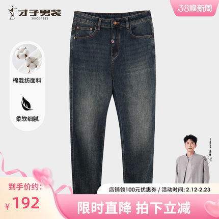 才子男装刺绣复古水洗牛仔裤男士2025秋冬季新款修身弹力休闲裤子