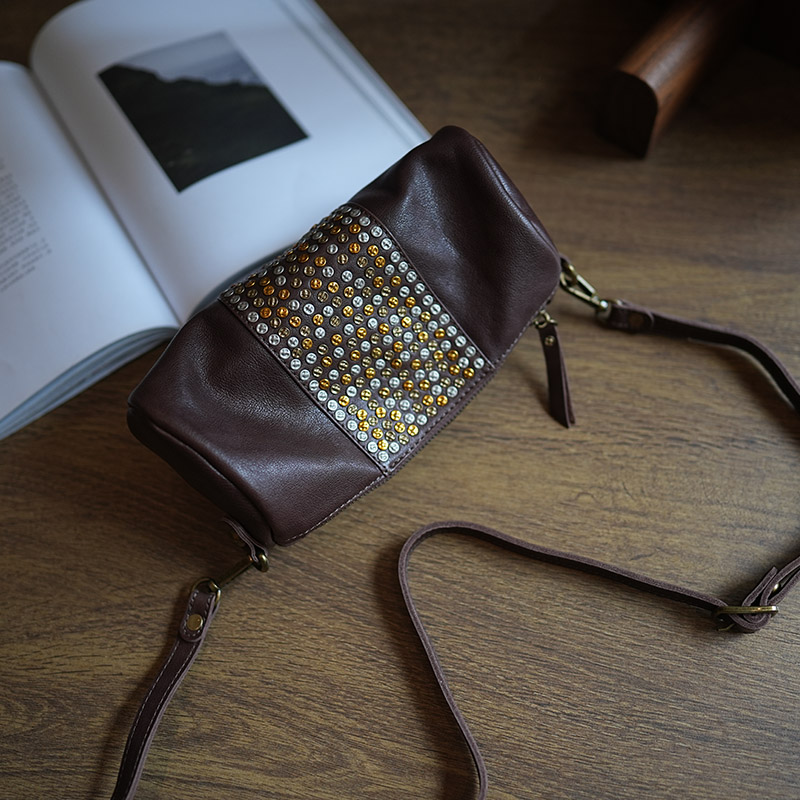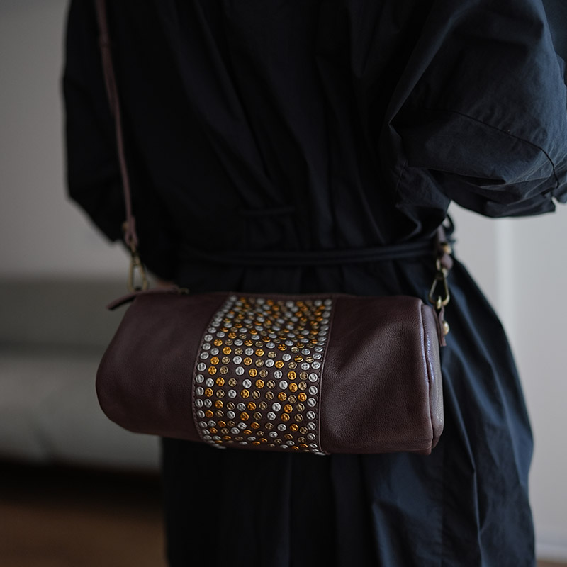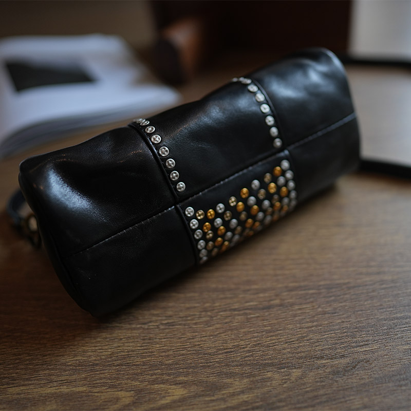 鹿小姐植鞣牛皮小众复古高级感铆钉圆筒枕头包真皮百搭单肩斜挎包