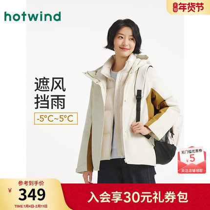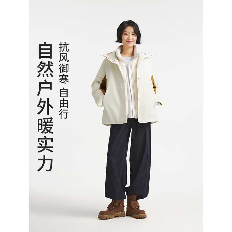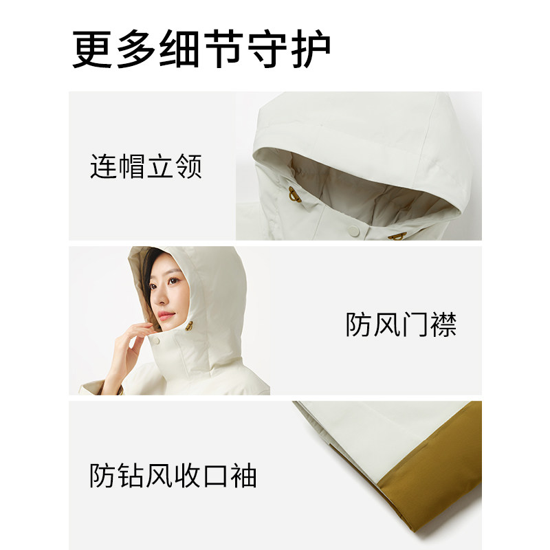 热风女士三防羽绒服外套2025年冬季新款机能风拼色户外连帽羽绒服