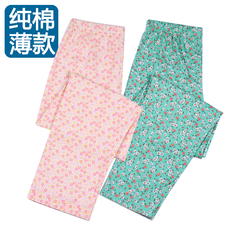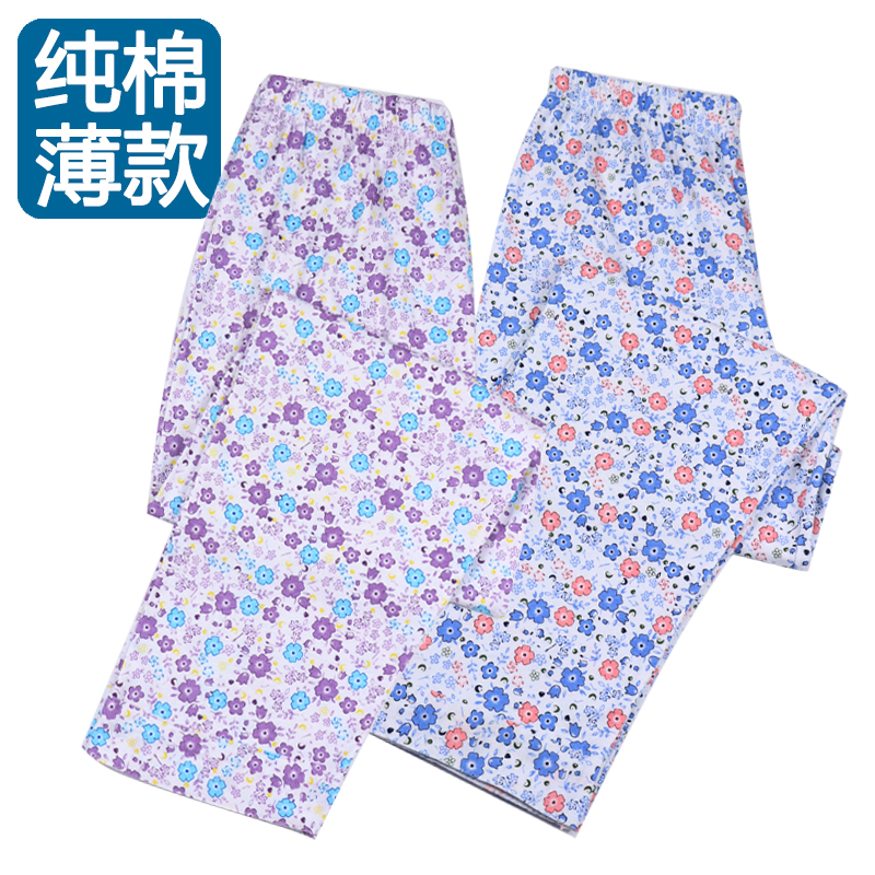 100%纯棉睡裤女中老年全棉家居裤宽松高腰印花长裤加大码薄空调裤
