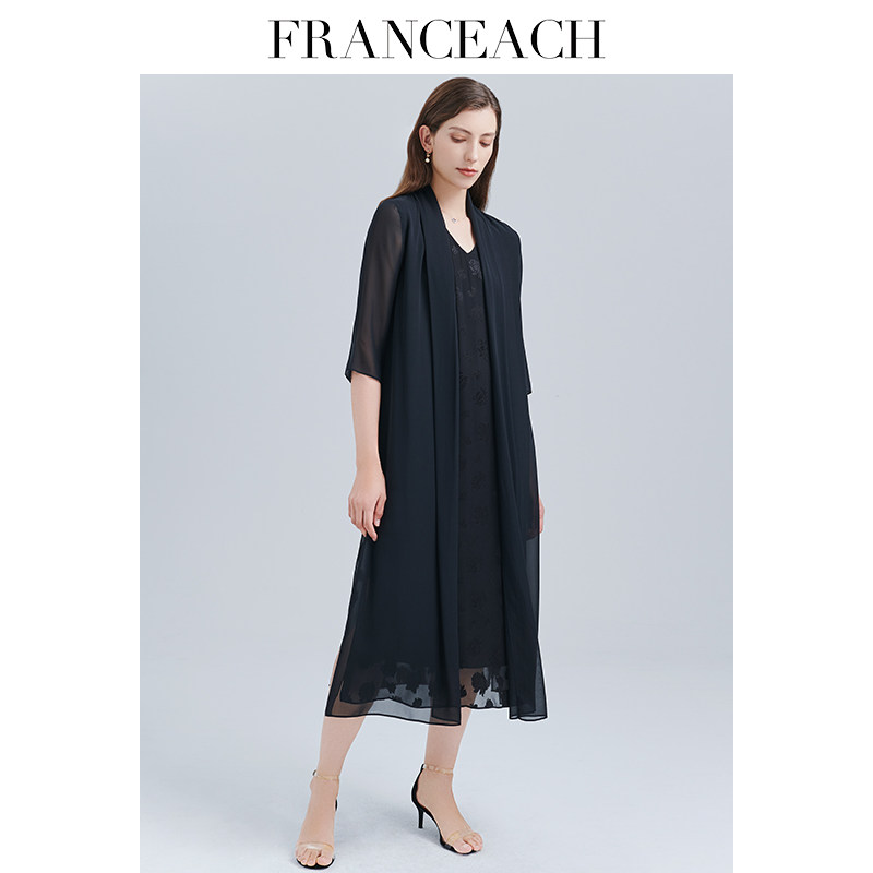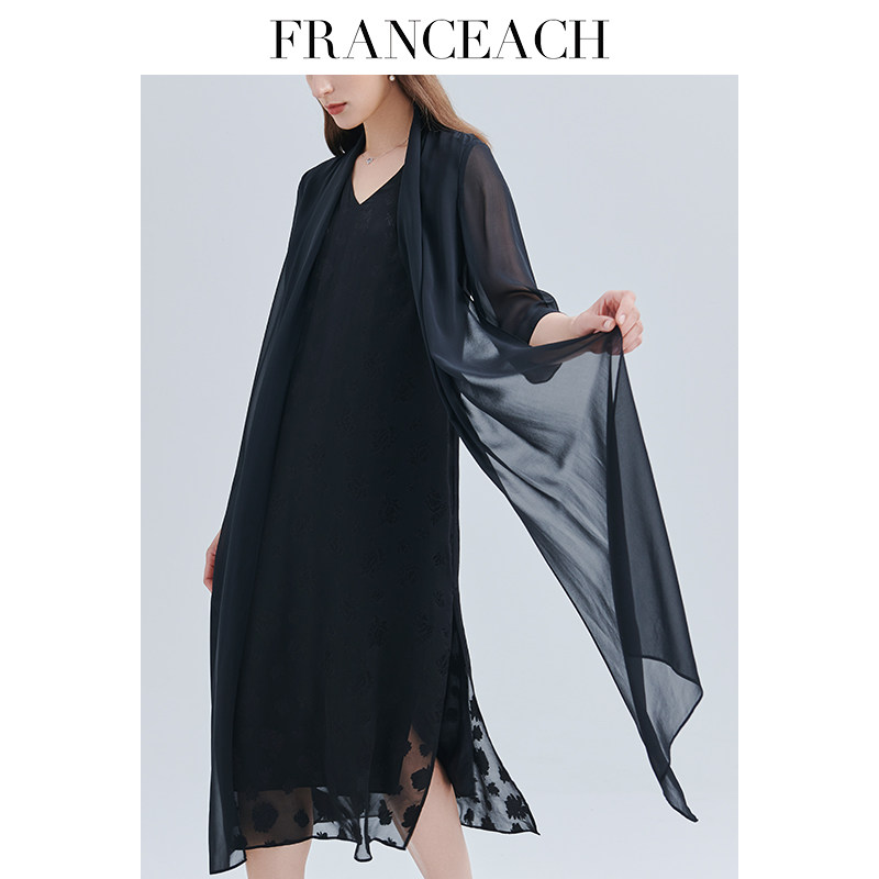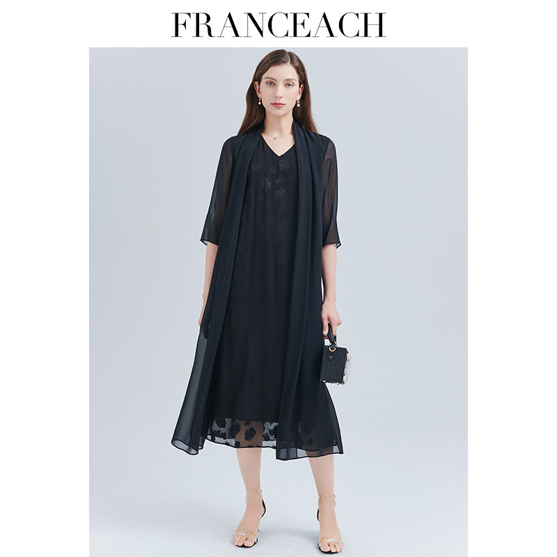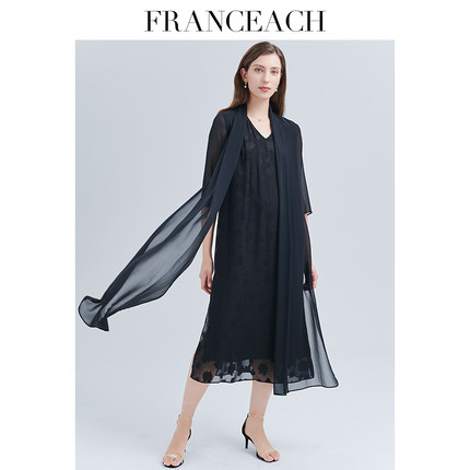 法涵意弛V领真丝长裙女2021年春新款宽松大码桑蚕丝连衣裙假两件