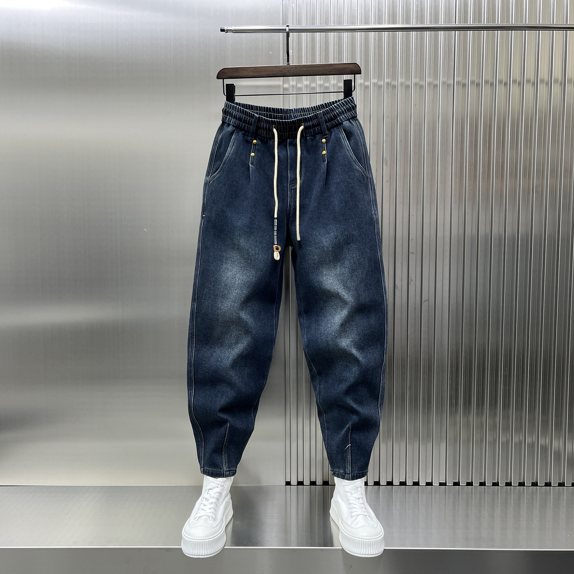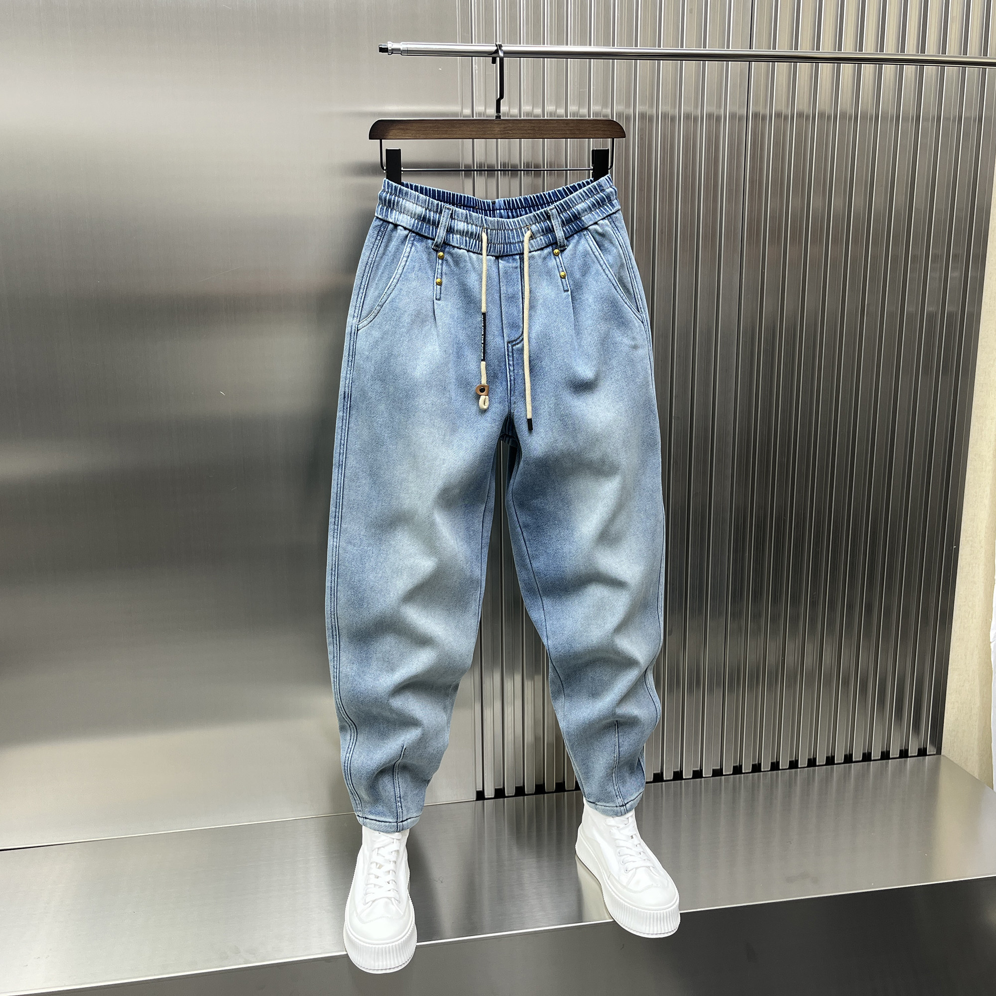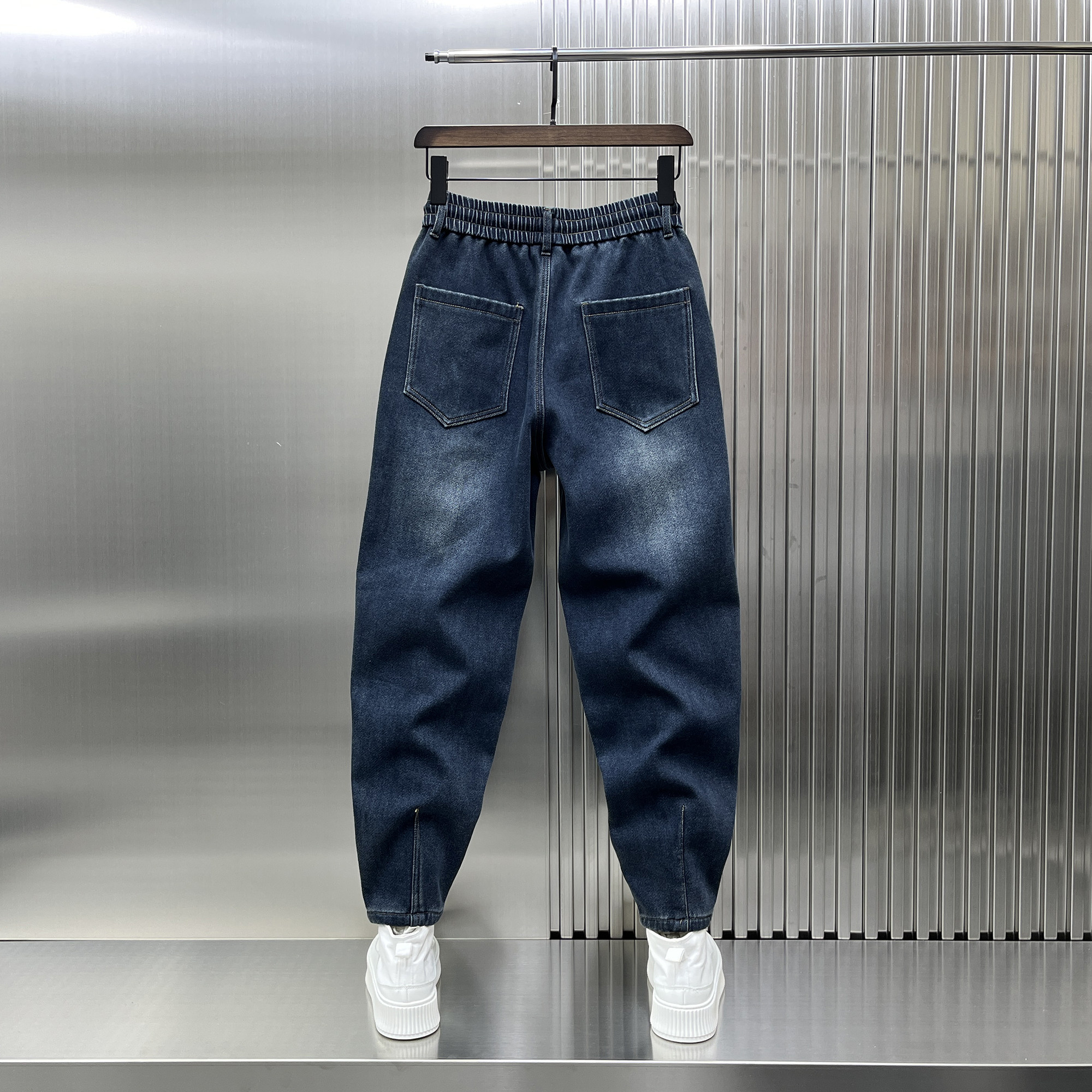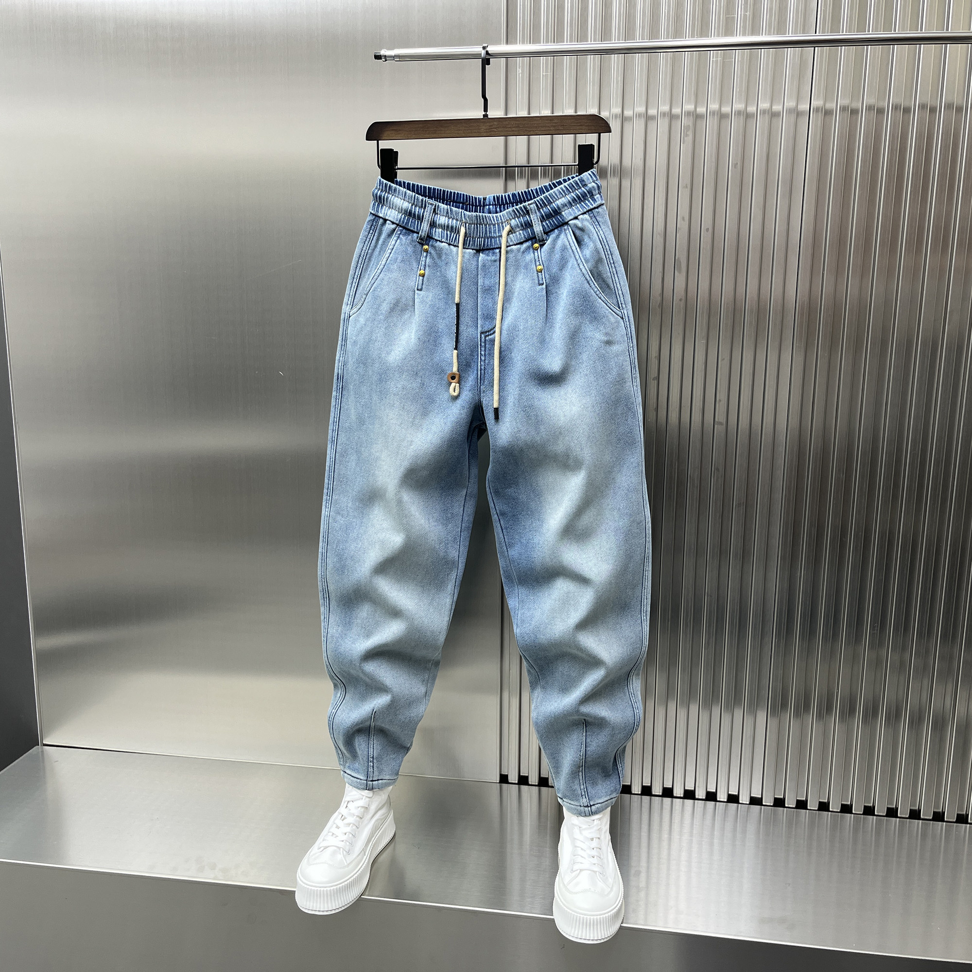 潮牌浅蓝色加绒水洗牛仔裤男士2024秋冬新款宽松百搭哈伦小脚裤潮