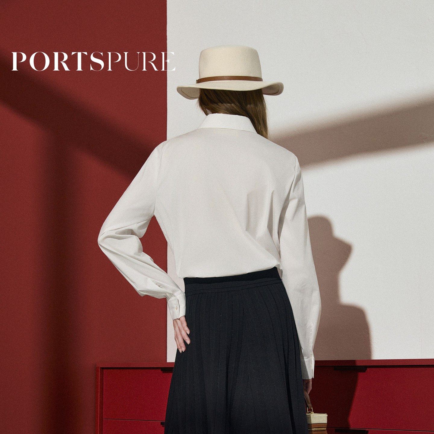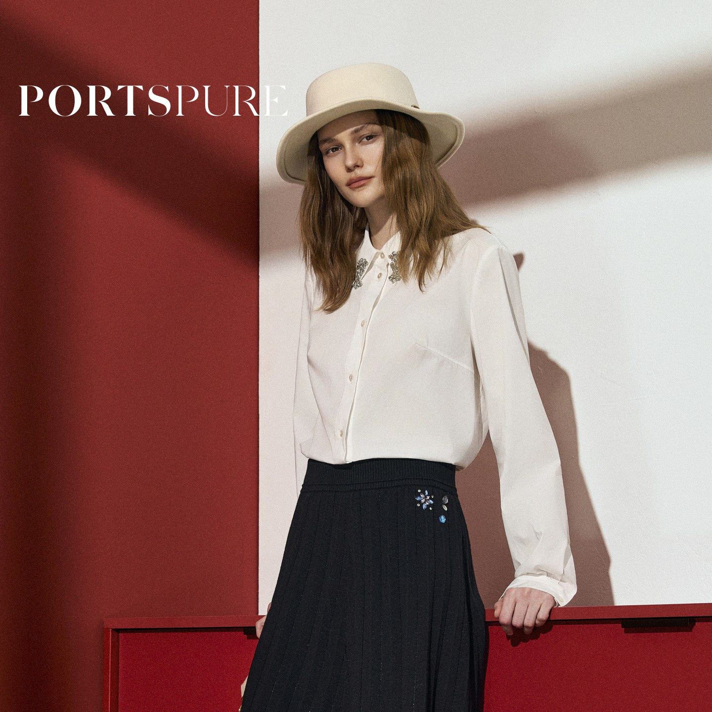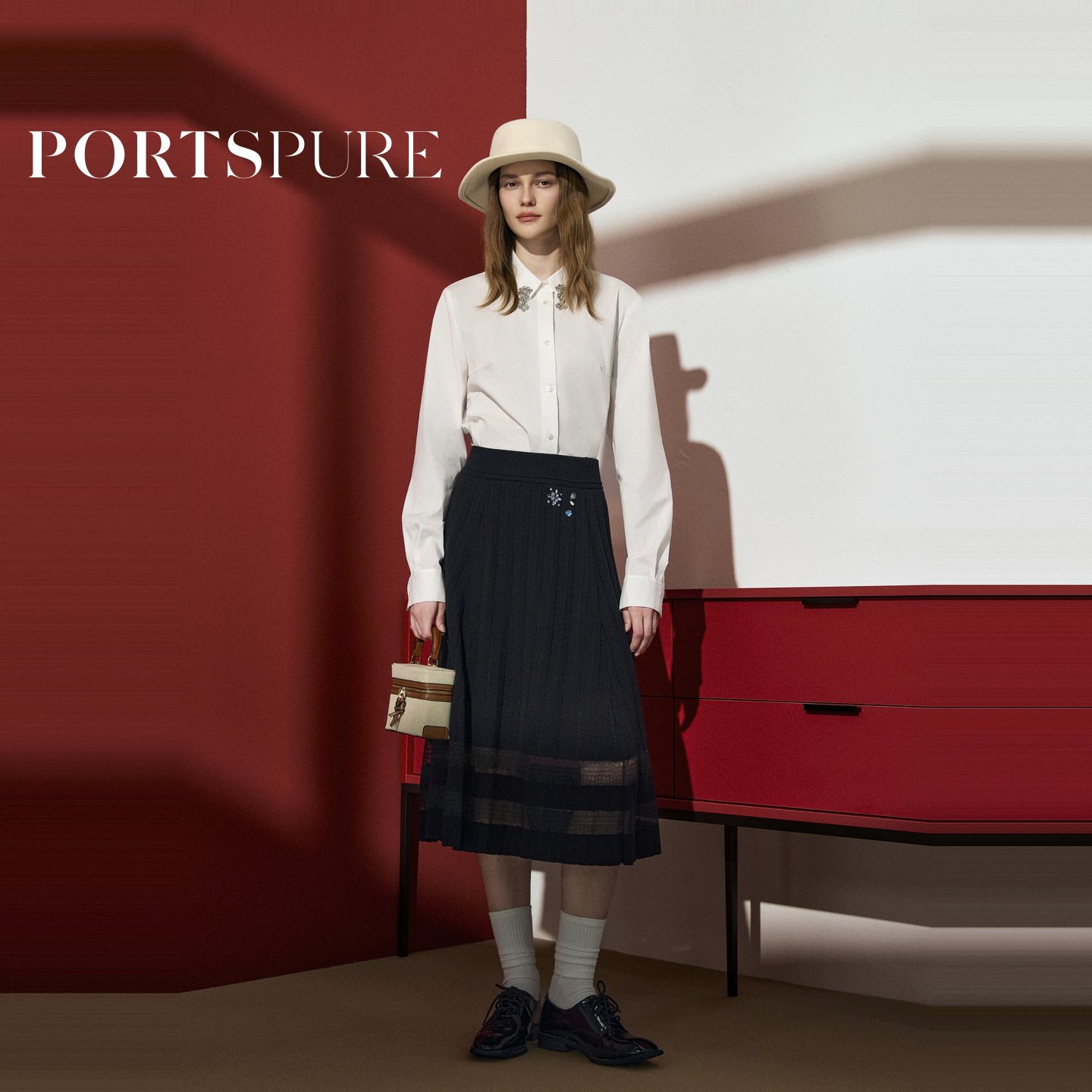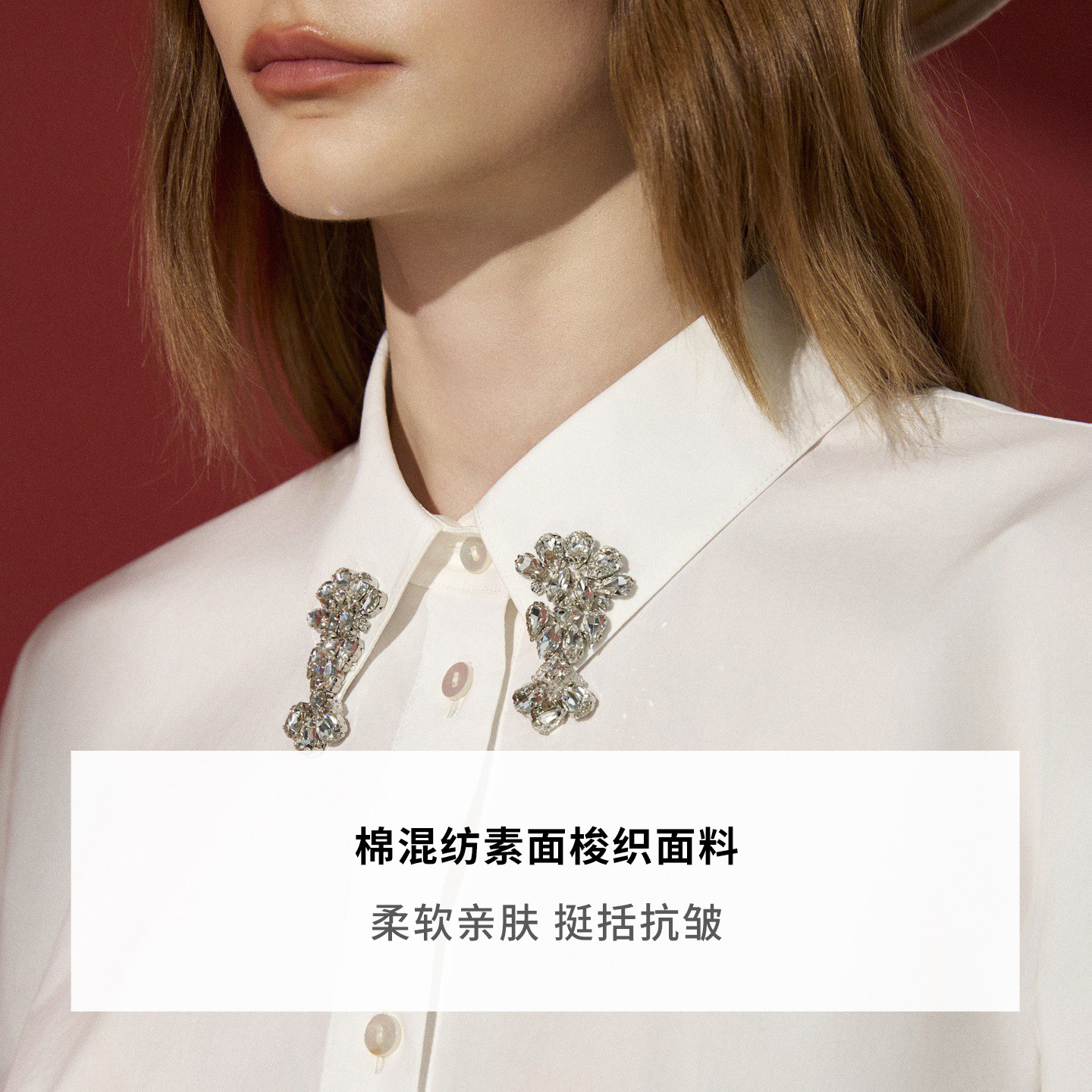 宝姿PORTSPURE女装2026早春新品钻饰翻领箱型衬衫