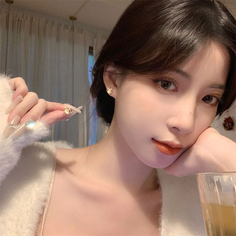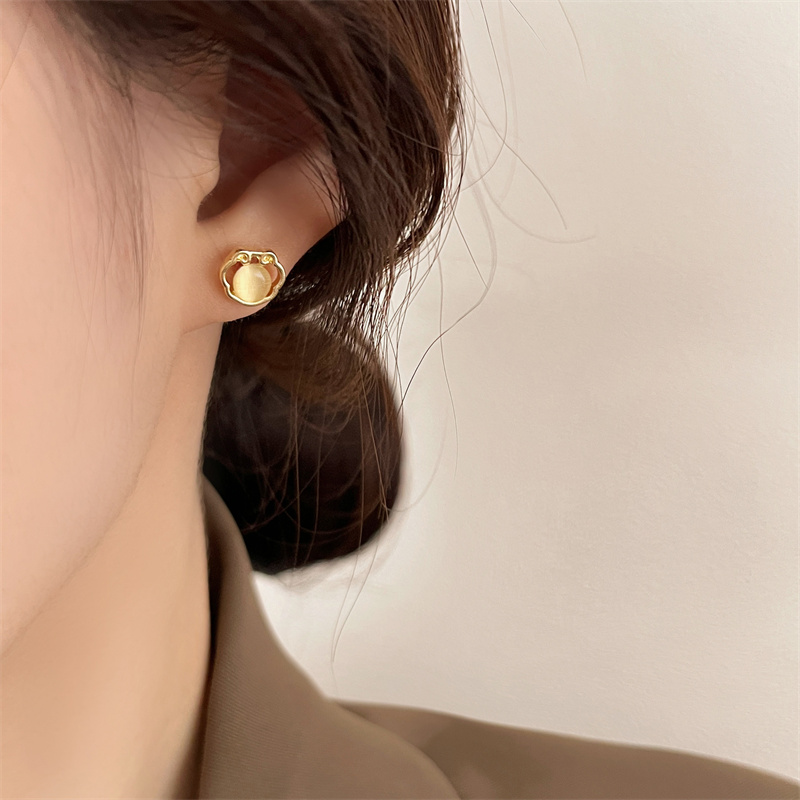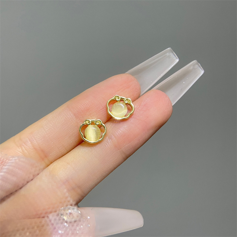 s925银针猫眼石如意平安长命锁耳钉女2023年新款潮古风耳环耳饰