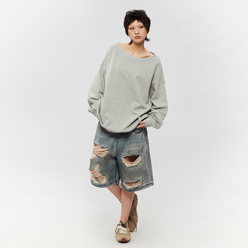 AIRHOOD 美式斜肩灰色卫衣女宽松慵懒风套头春秋季露肩一字肩上衣