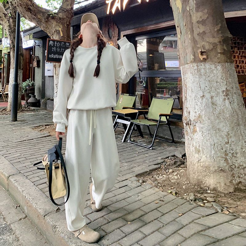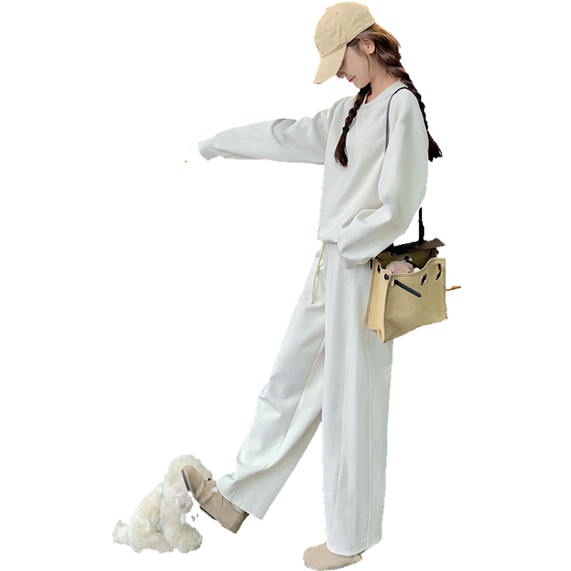 简约韩版女两件套2025阔腿裤卫衣套头新款白色秋长袖休闲运动套装