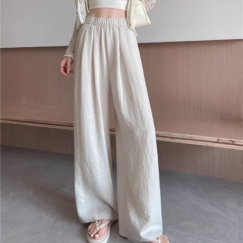 华子家 亚麻混纺阔腿裤女25夏季新款肌理感松紧腰直筒休闲裤42848