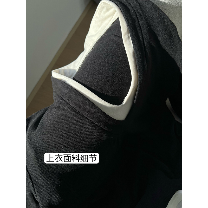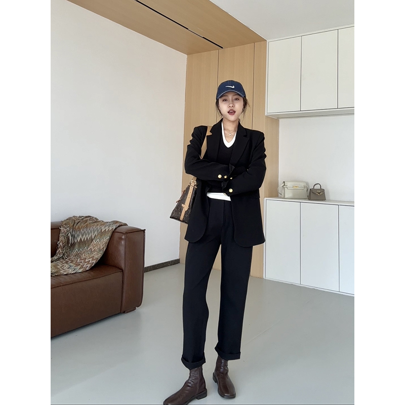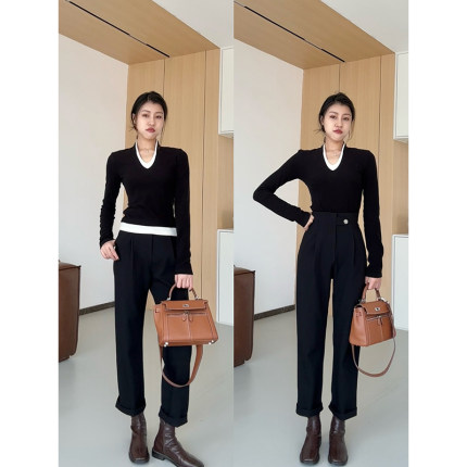 张阿星【黑糖套装】2023冬新款假两件小V领针织衫+高腰遮胯直筒裤