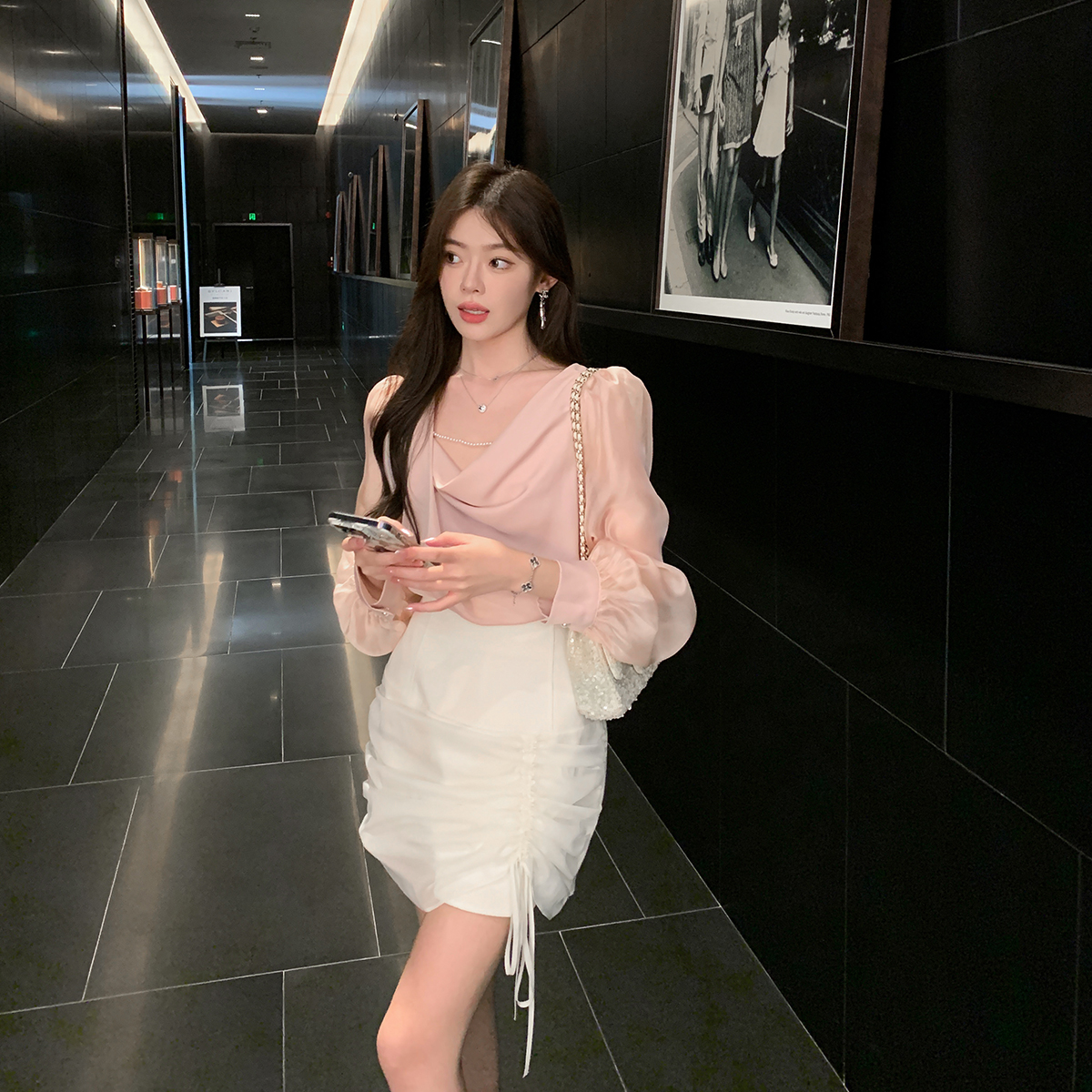 ByYou 夏季白色高腰半身裙女设计感抽皱网纱拼接显瘦包臀短裙子