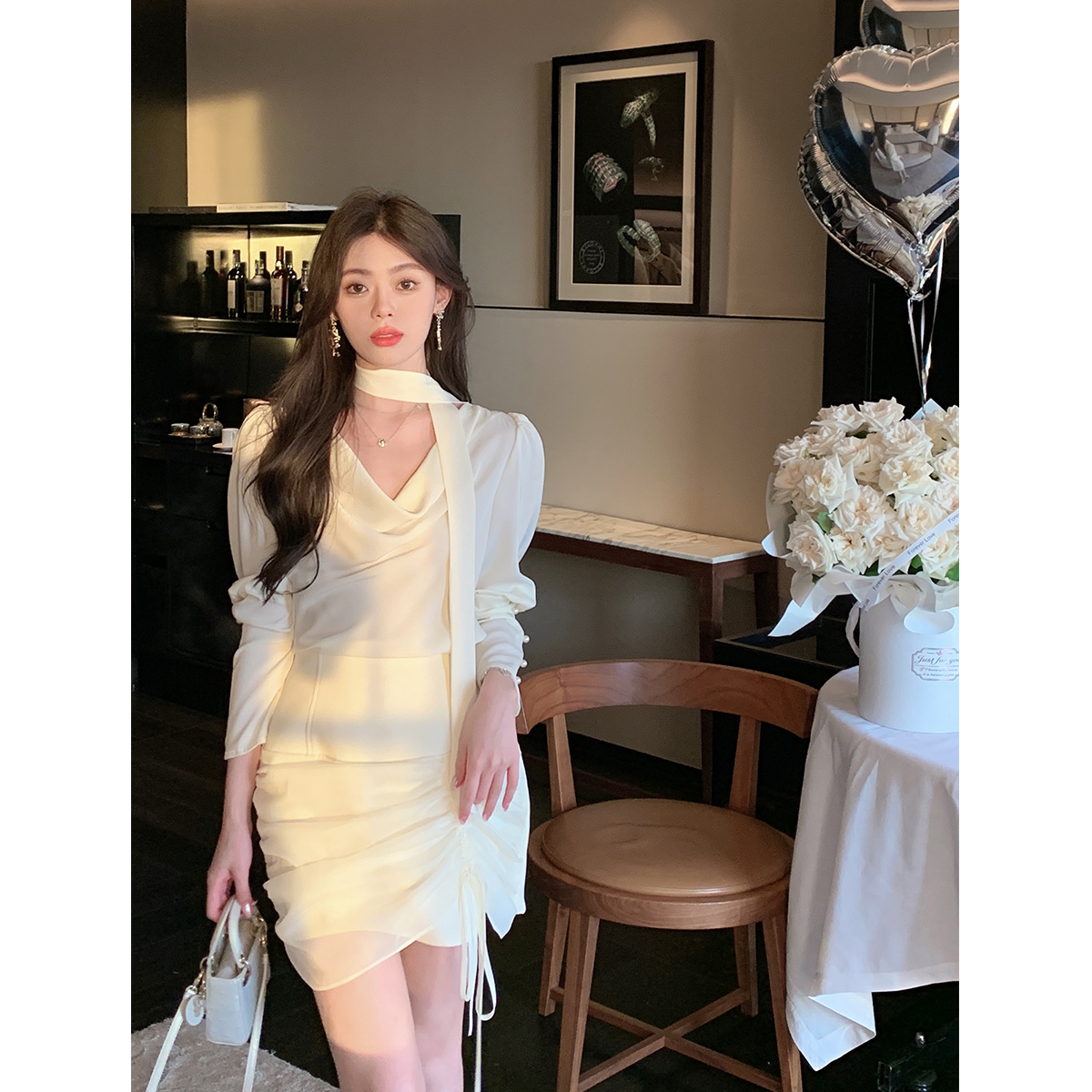 byyou设计感抽褶网纱拼接包臀裙