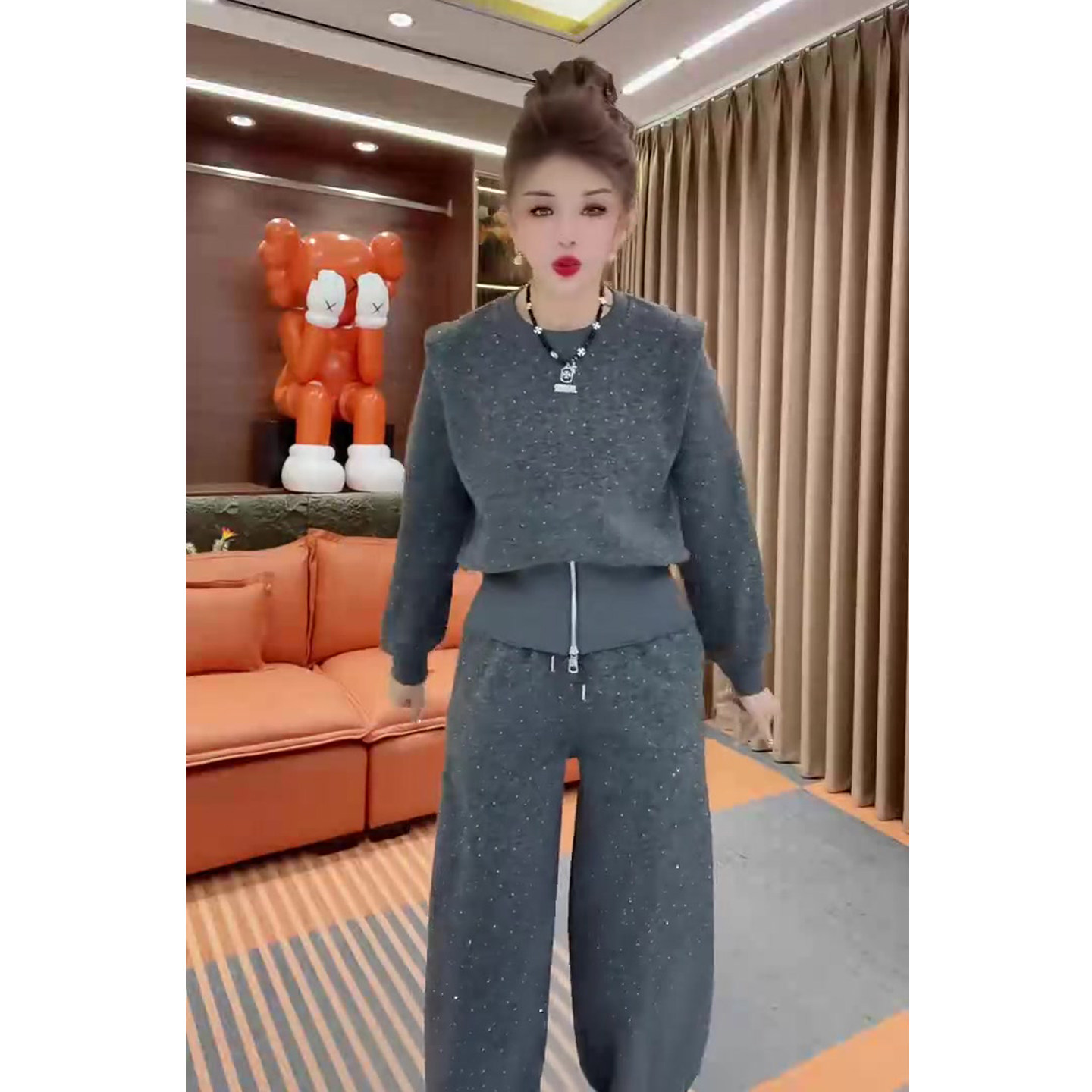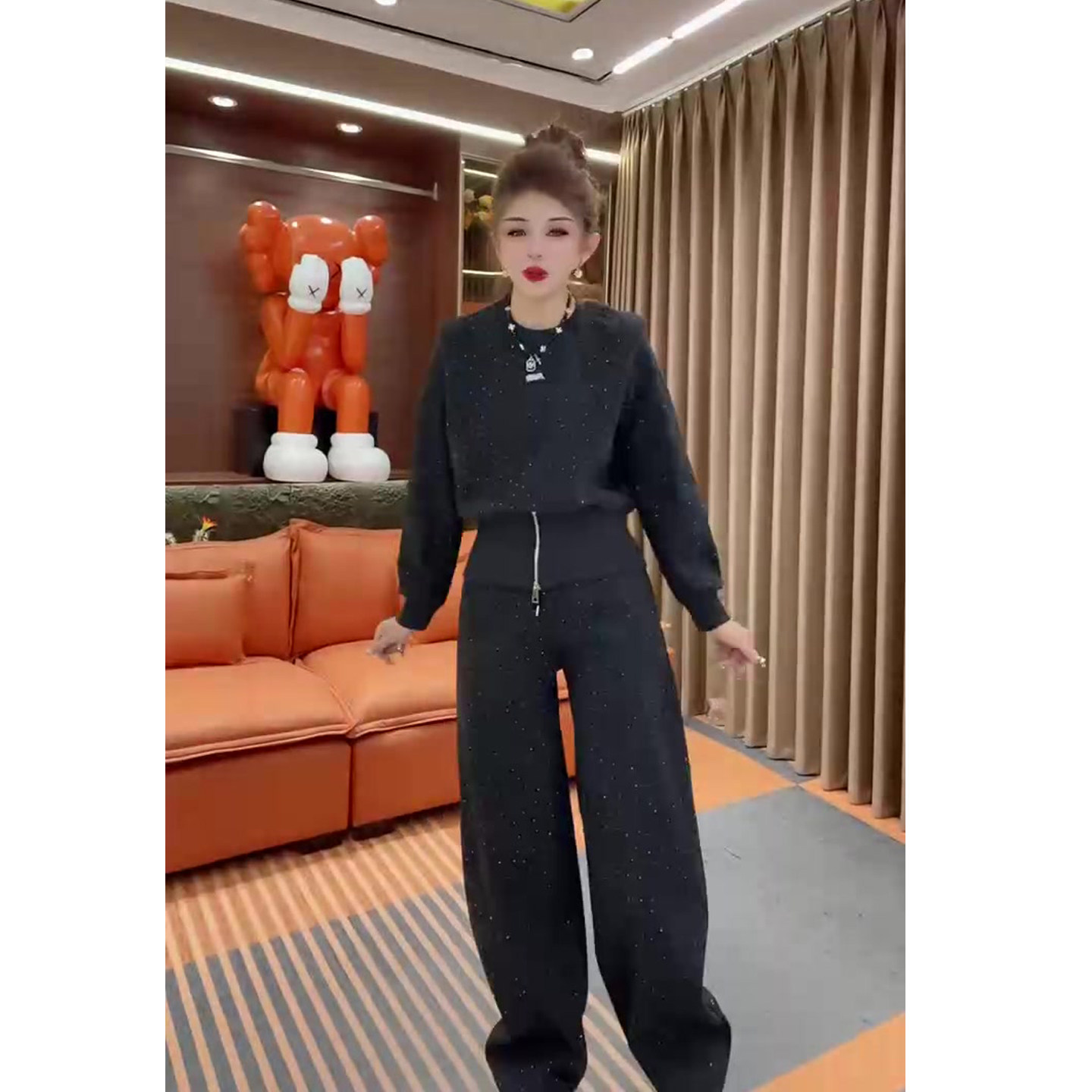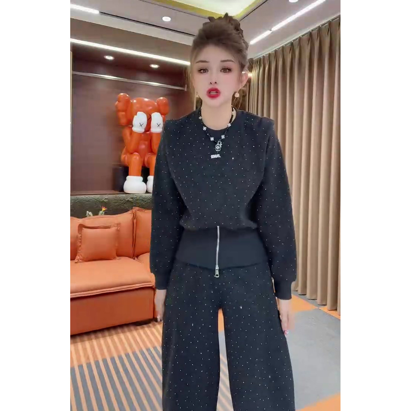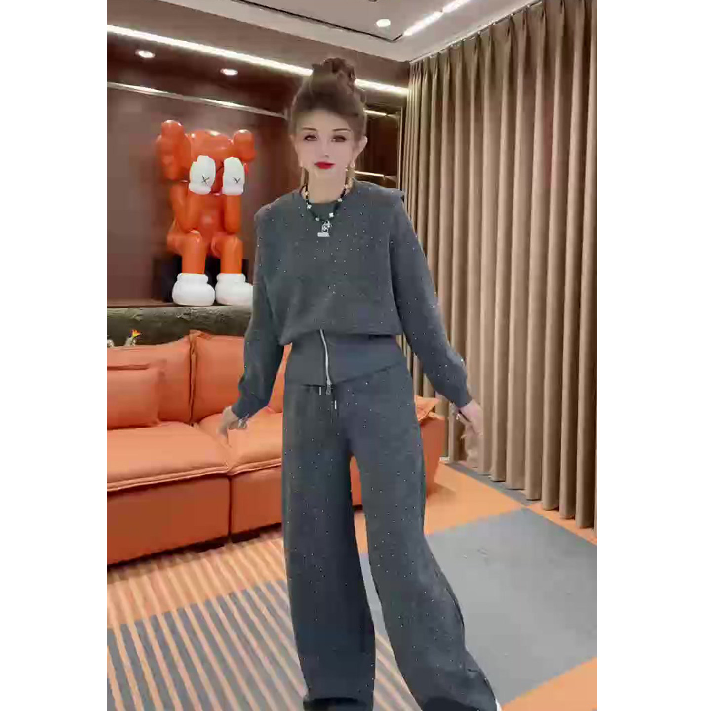轻奢重工时尚套装女2025冬季新款烫钻圆领上衣+高腰阔腿裤两件套