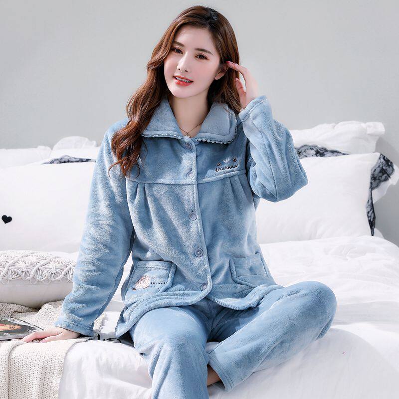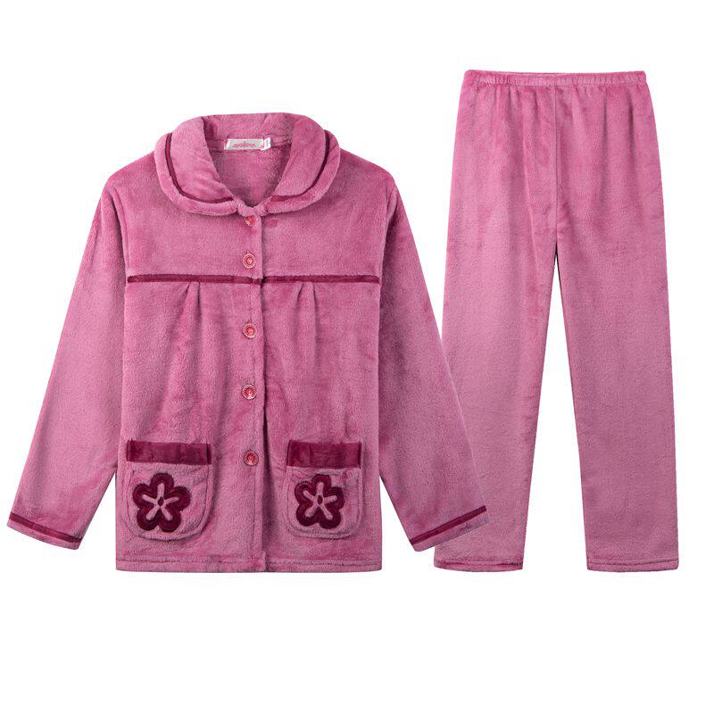 秋冬加厚珊瑚绒睡衣套装女士加绒法兰绒长袖中老年开衫大码家居服