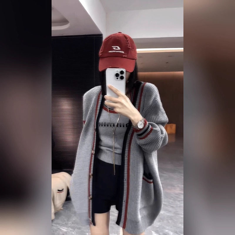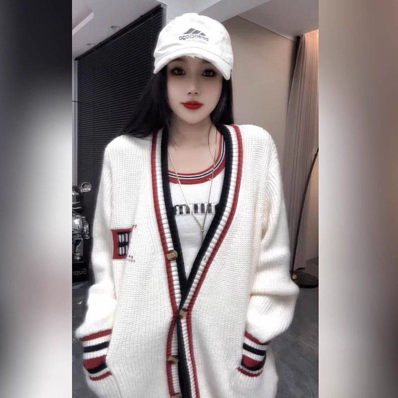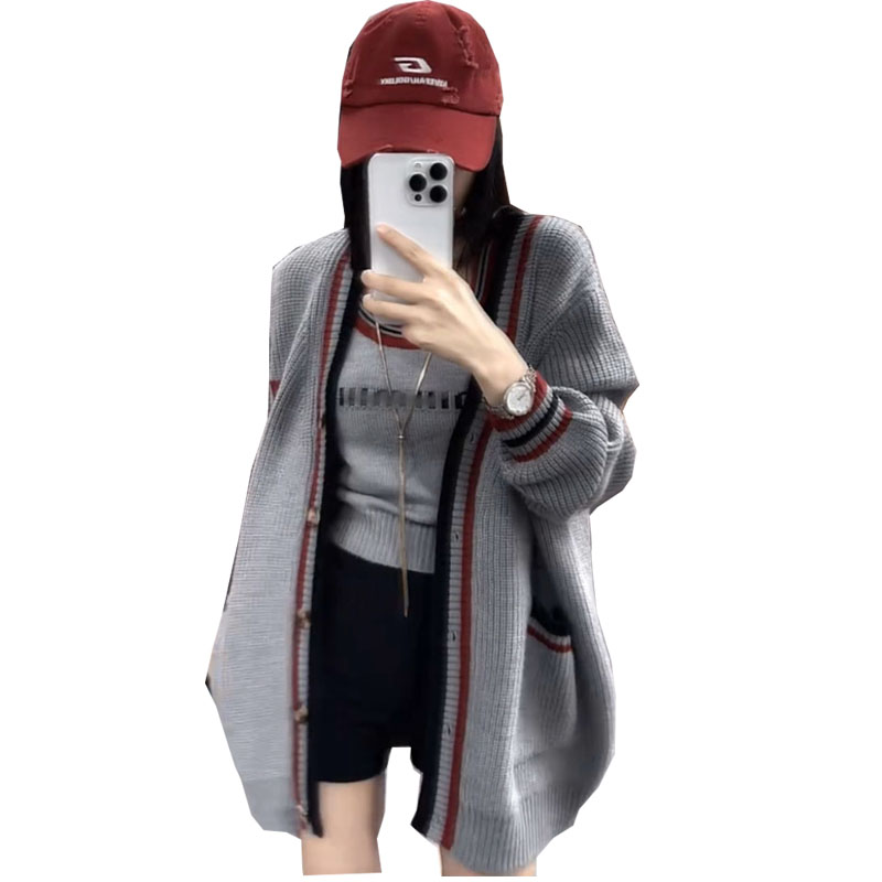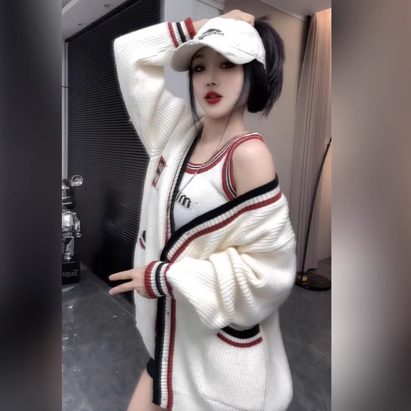 秋冬新款中长款针织开衫吊带背心两件套装上衣辣妹撞色毛衣外套女