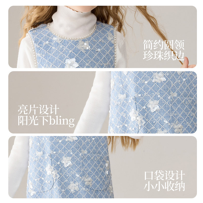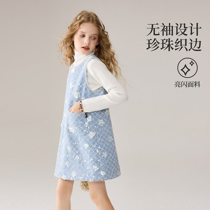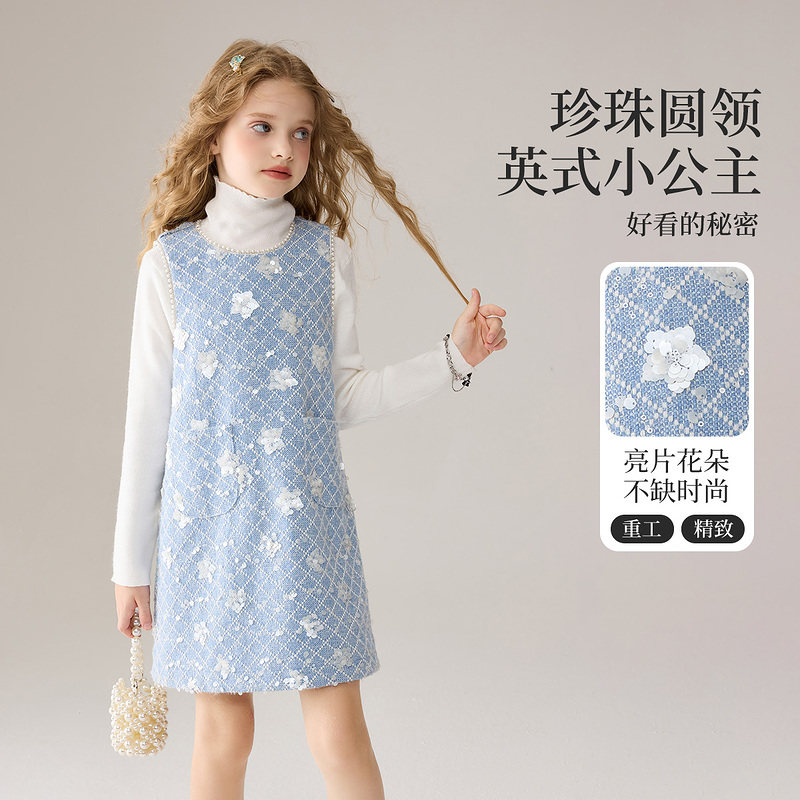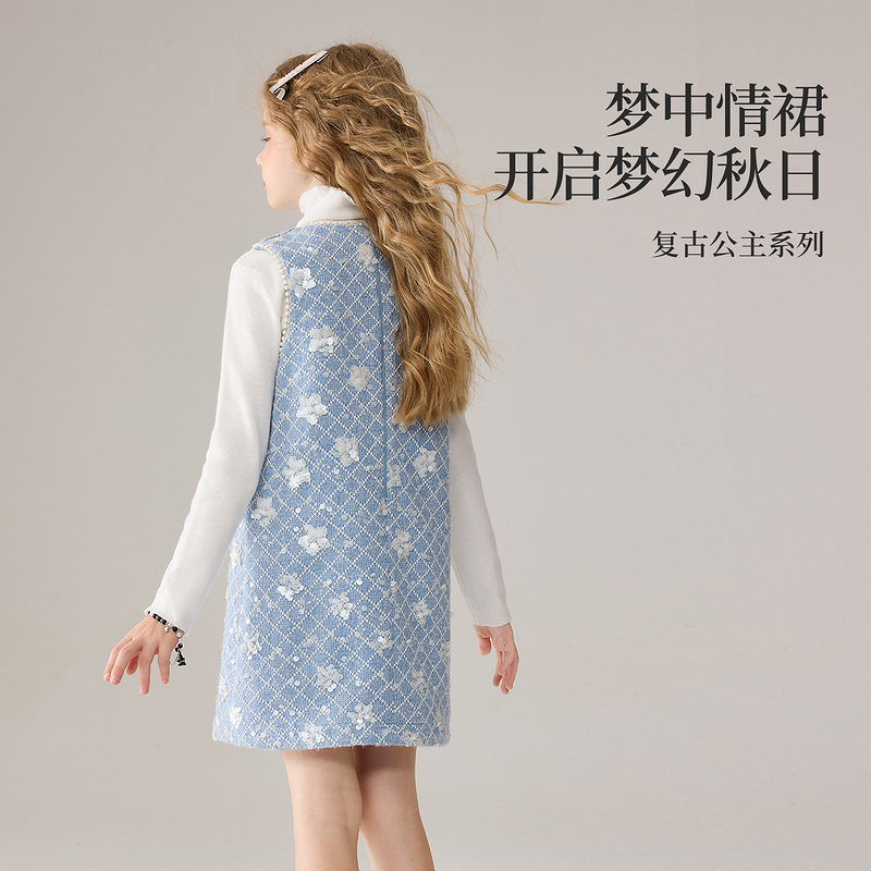 ask儿童裙子2025冬季新款女童优雅小香风中大童蓝色连衣裙