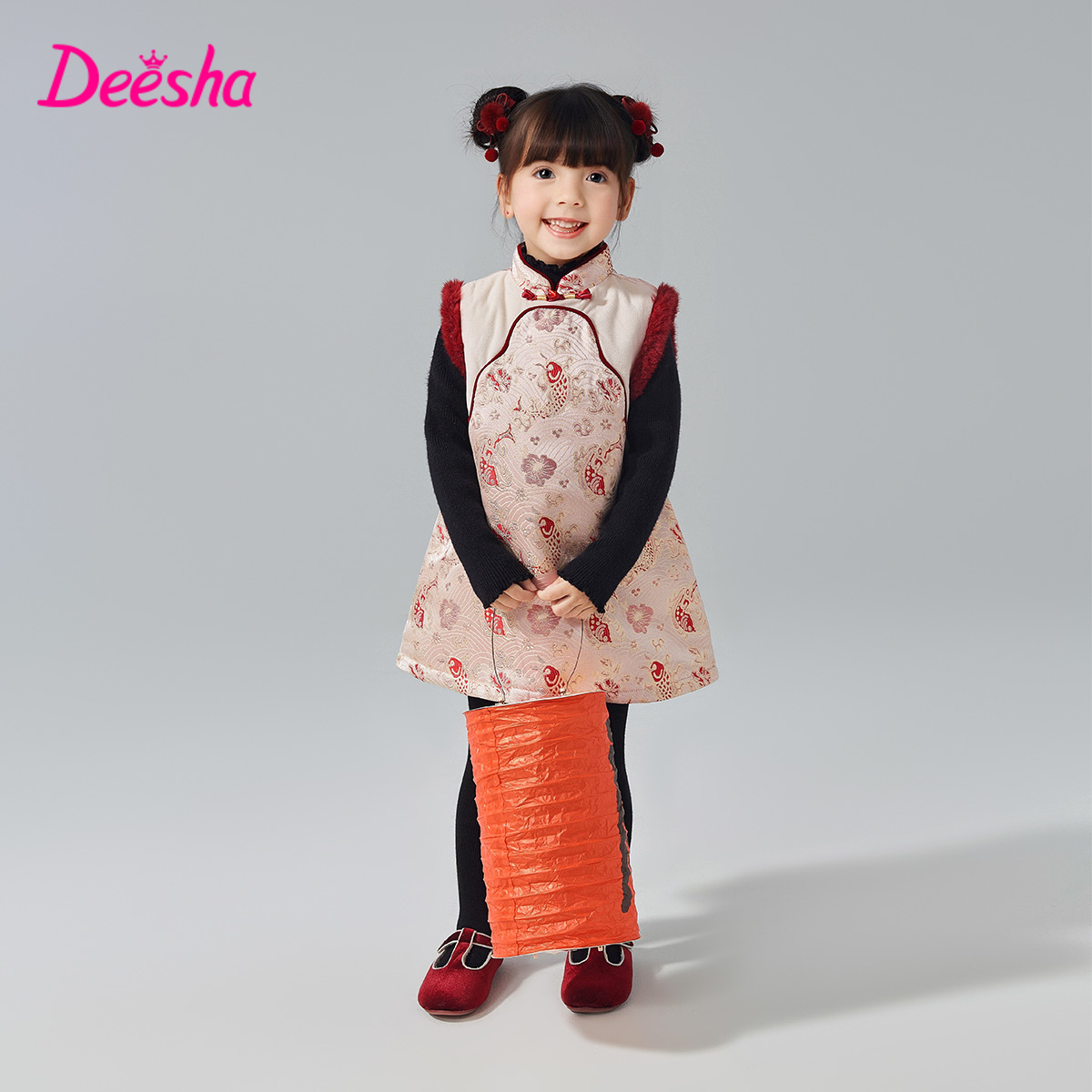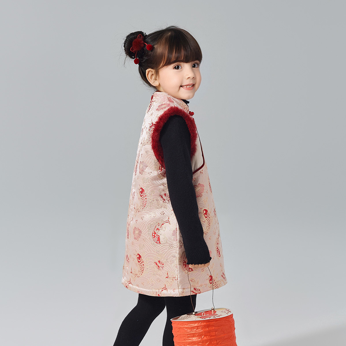 笛莎女童裙子官方冬季新款宝宝唐装刺绣绗棉背心裙红色新年服儿童