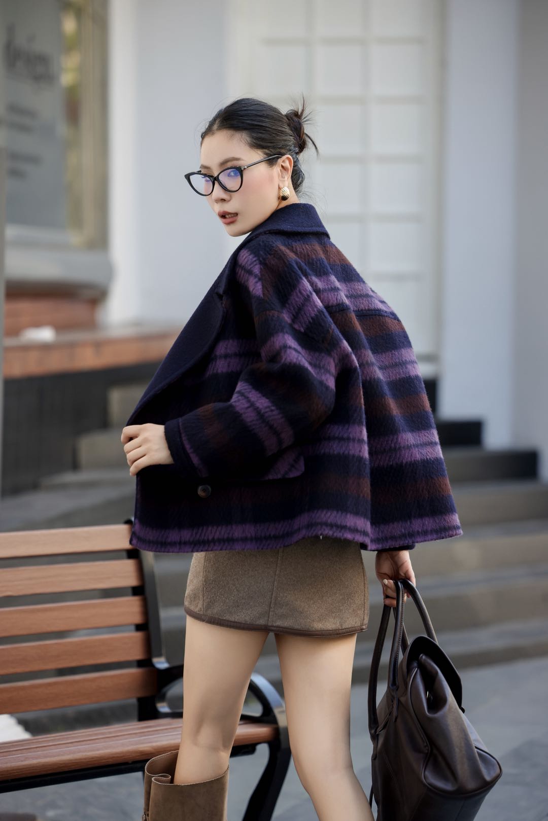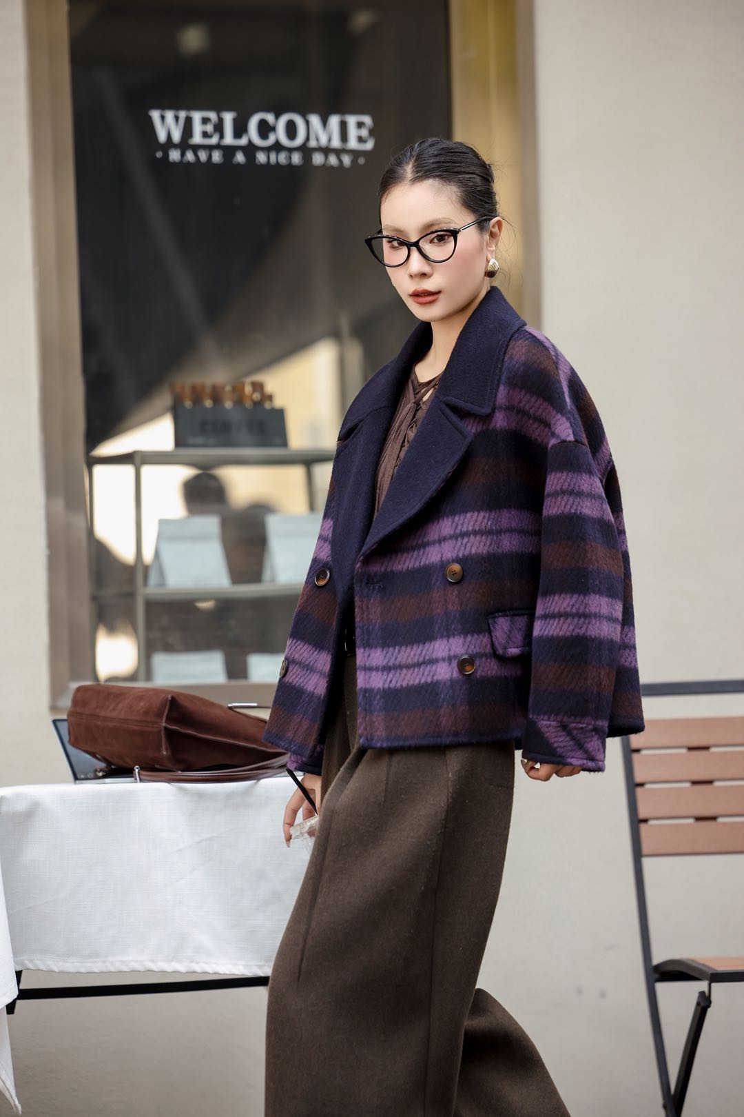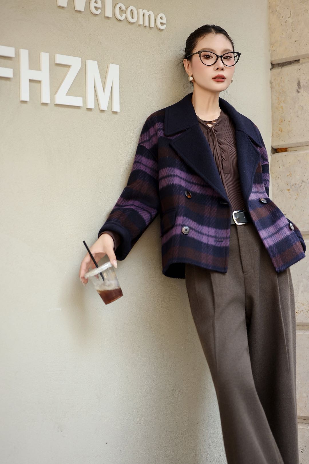 条纹格子羊毛毛呢外套女短款宽松西装领双排扣小个子双面羊绒大衣