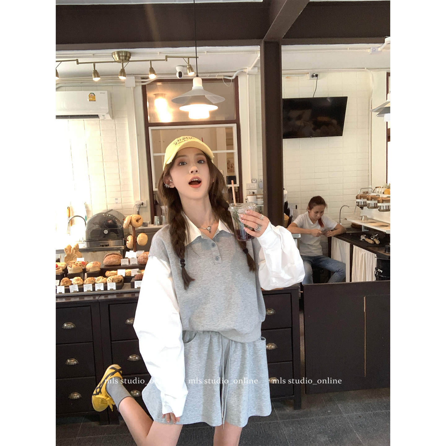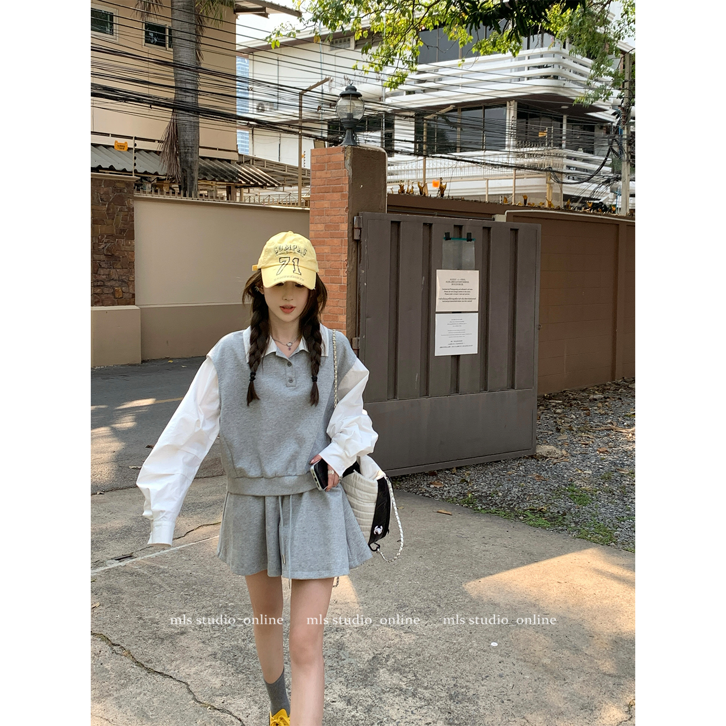 MLS 氧气甜妹 假两件卫衣拼接衬衫套装女春季运动风半身裙两件套