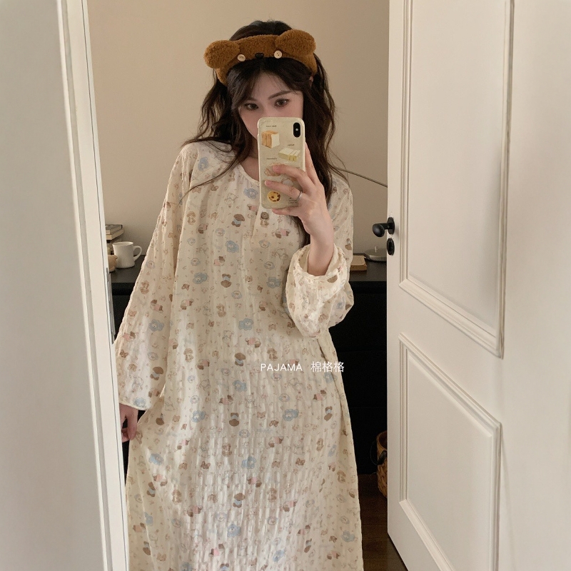 睡裙女春秋季长袖甜美可爱ins公主风宽松休闲睡衣中长裙子家居服