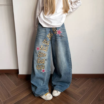 美式复古豹纹字母印花牛仔裤
