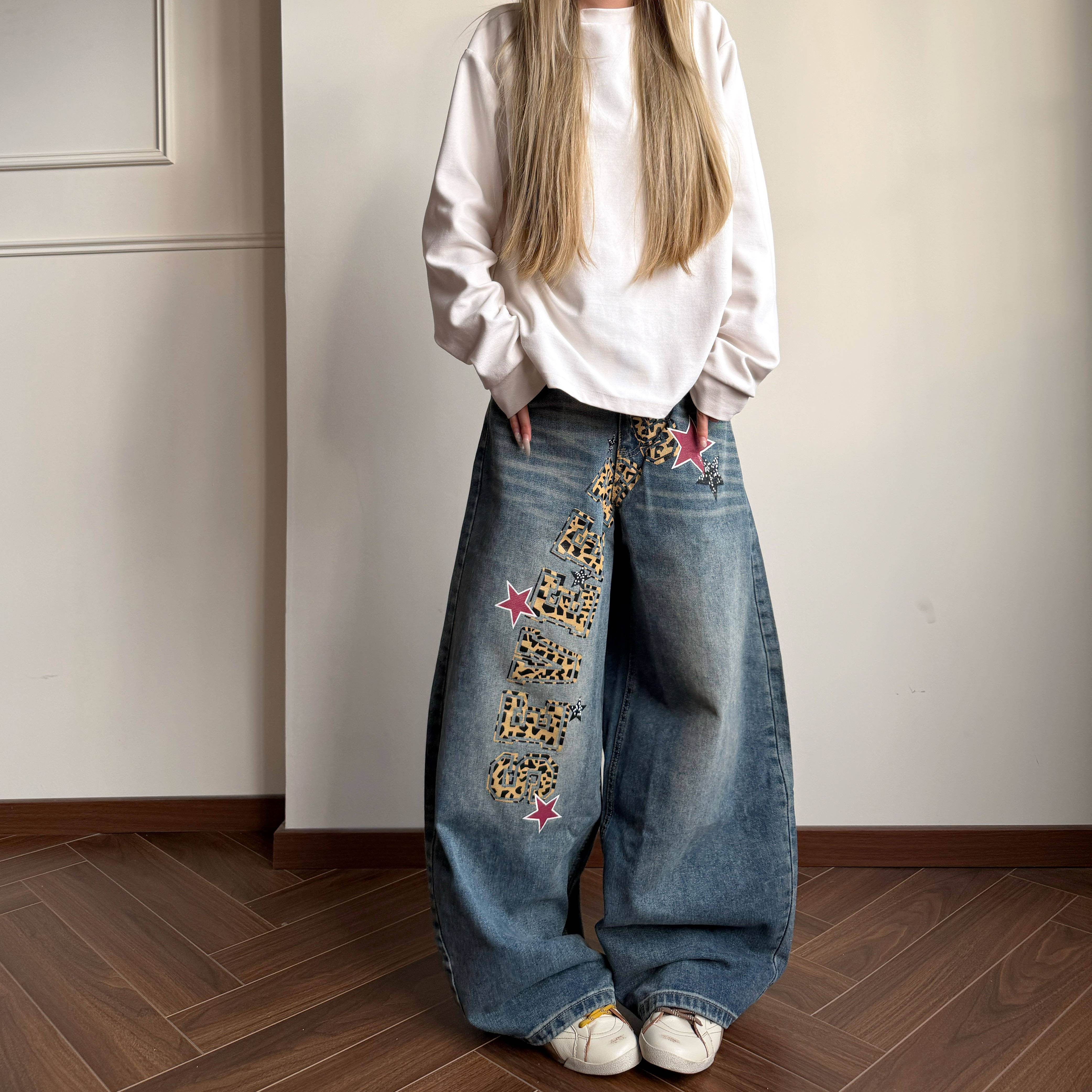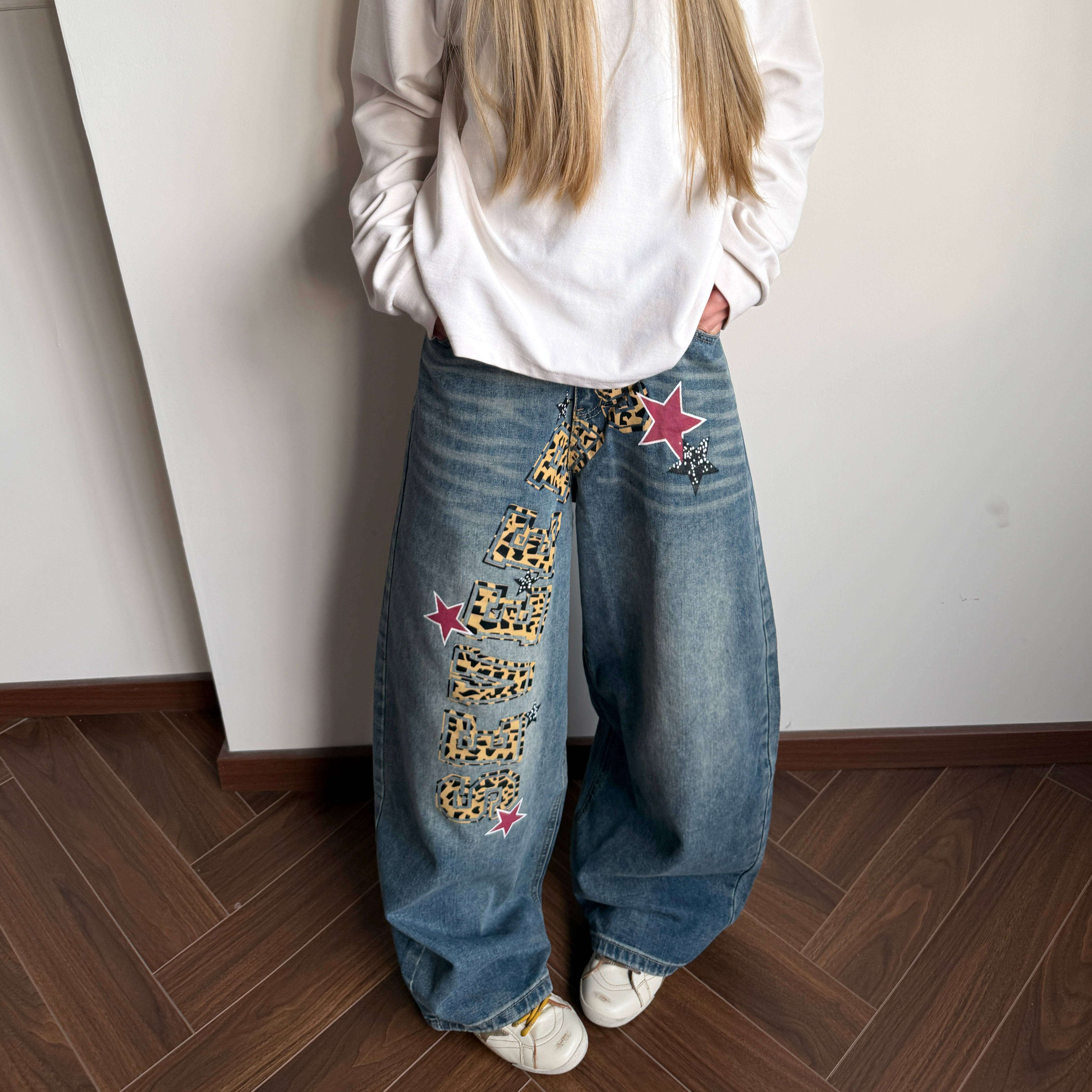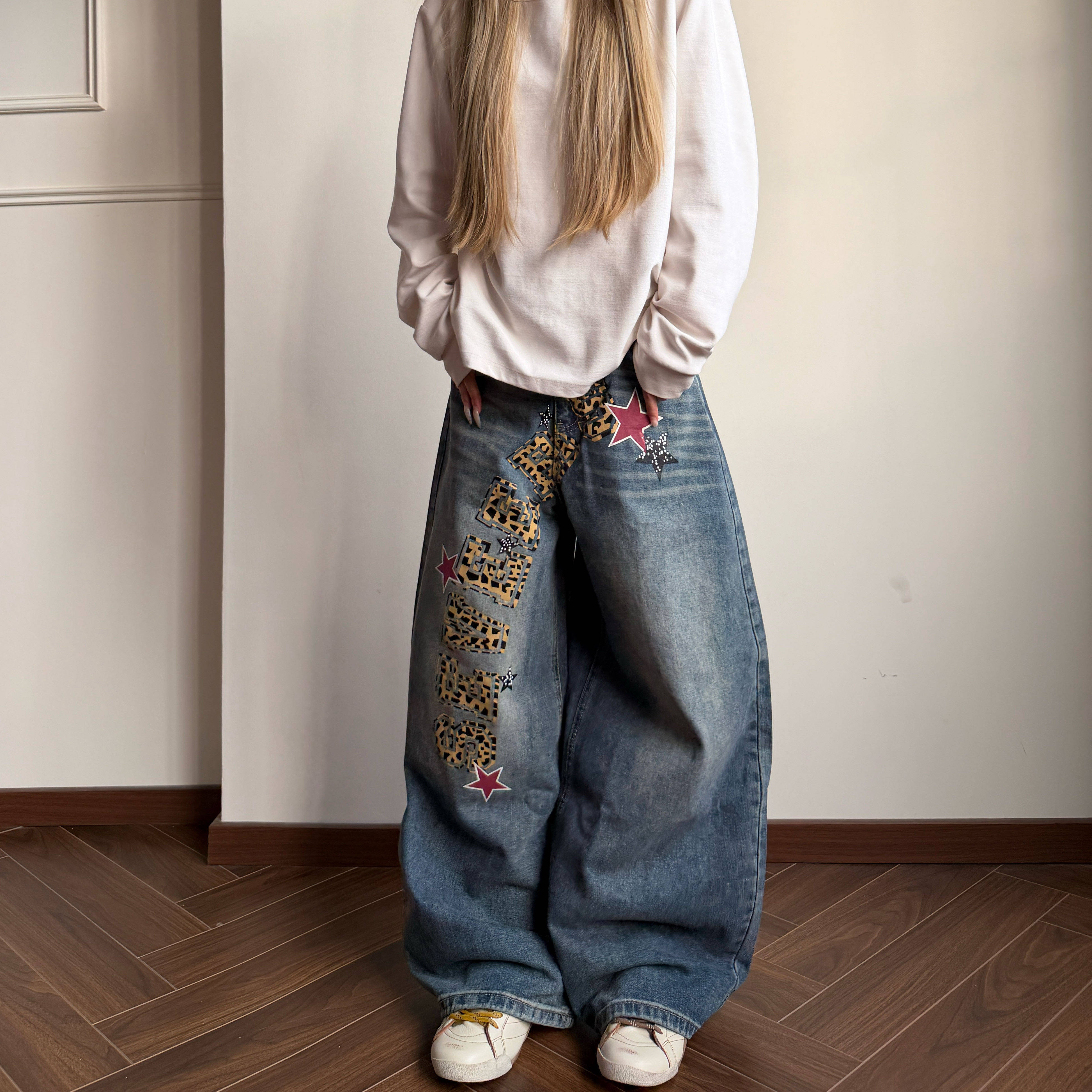 Amoeba美式复古水洗做旧豹纹字母星星宽松阔腿弯刀牛仔男女长裤