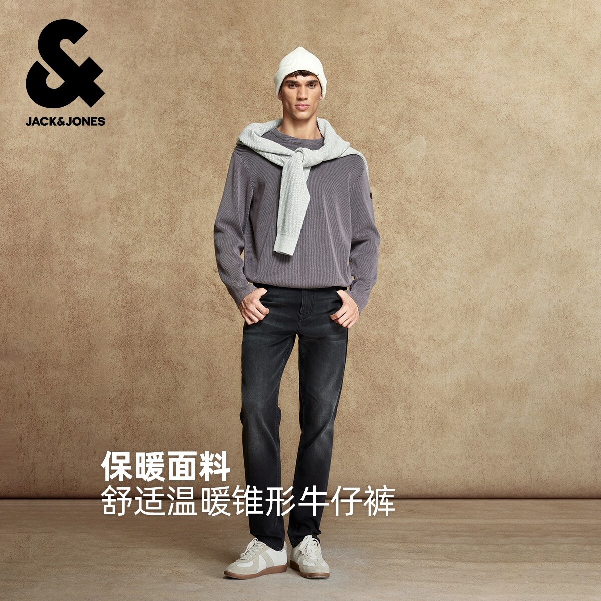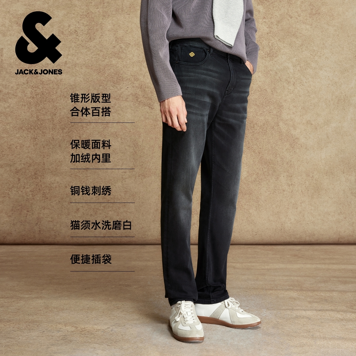 绫致杰克琼斯男牛仔裤秋冬时尚简约刺绣加绒内里水洗锥形裤子